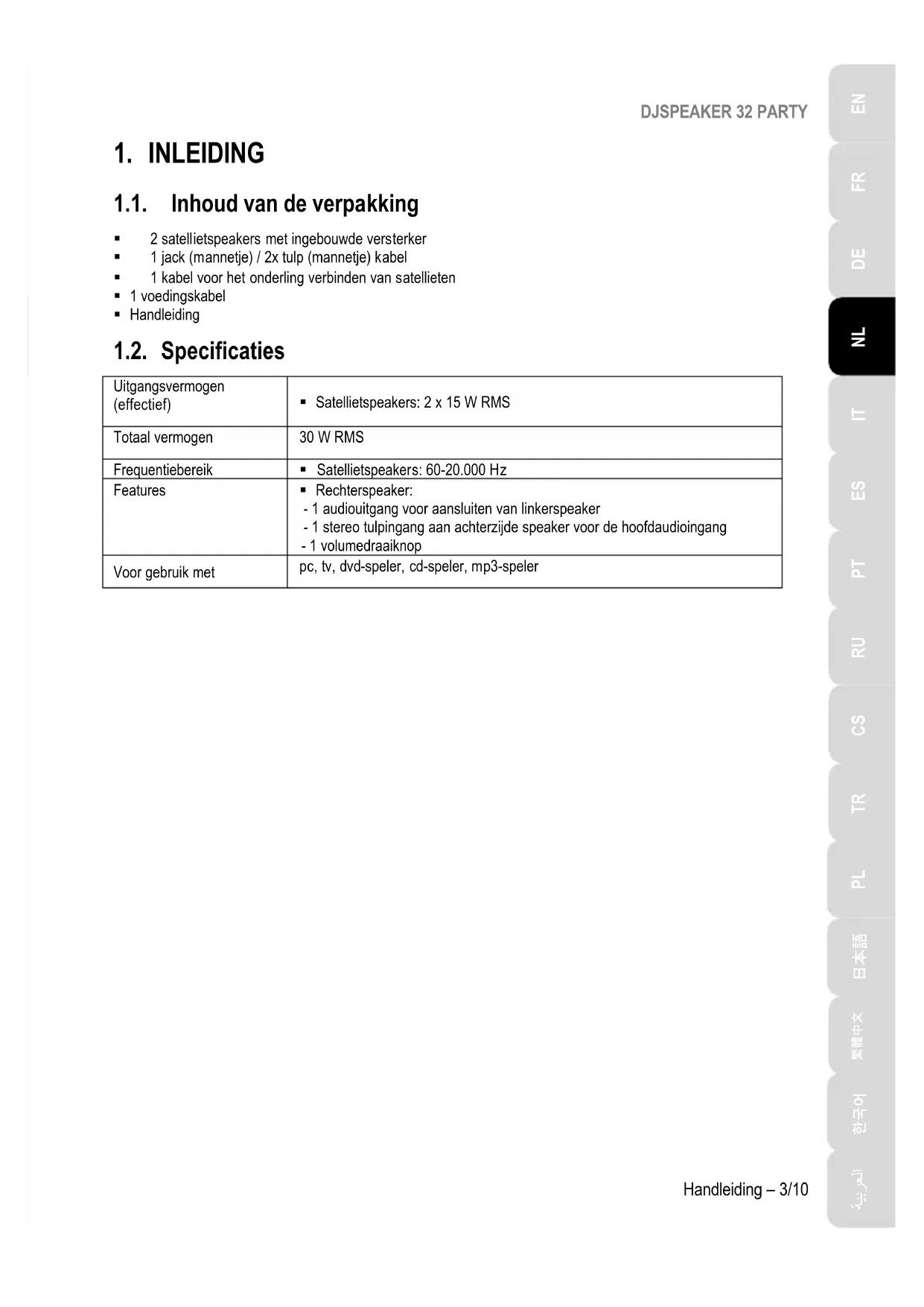 1.1. Inhoud van de verpakking 2 satellietspeakers met ingebouwde versterker 1 jack (mannetje) / 2x tulp (mannetje) kabel 1 kabel voor het onderling verbinden van satellieten 1 voedingskabel Handleiding 1.2. Specificaties Uitgangsvermogen (effectief) Satellietspeakers: 2 x 15 W RMS Totaal vermogen 30 W RMS Frequentiebereik Satellietspeakers: 60-20.000 Hz Features Rechterspeaker: - 1 audiouitgang voor aansluiten van linkerspeaker - 1 stereo tulpingang aan achterzijde speaker voor de hoofdaudioingang - 1 volumedraaiknop Voor gebruik met pc, tv, dvd-speler, cd-speler, mp3-spelerDJSPEAKER 32 PARTY 4/10 – Handleiding 1.3. Aanbevelingen - Plaats de satellietspeakers op een vlakke ondergrond om te voorkomen dat ze omvallen. - Maak de speakerkit nooit open omdat het gevaar bestaat dat daarbij interne onderdelen worden beschadigd. - Deze speakerkit is bestemd voor gebruik in een gematigde omgeving. - Voorkom brand en elektrische ontlading door de speakerkit niet bloot te stellen aan: - regen, vocht en andere vloeistoffen, zoals water en chemische producten - hittebronnen als cv-radiatoren, open haard en andere warmte producerende apparaten (met inbegrip van versterkers) - direct zonlicht. - Stel de speakerkit niet bloot aan druppelend of spetterend water. - Zet nooit een met vloeistof gevuld object zoals een glas water of een vaas met bloemen op de speakerkit. - Maak de voedingskabel los als de speakerkit langere tijd niet wordt gebruikt. Maak de voedingskabel los door de stekker vast te pakken en daar aan te trekken. Trek nooit aan de kabel zelf. - Zorg er voor dat de stekker van de speakerkit die in het stopcontact zit altijd goed bereikbaar is. - Haal de stekker uit het stopcontact voordat u de speakerkit schoonmaakt. Gebruik een vochtige doek voor het reinigen en vermijd het gebruik van schoonmaakmiddelen in spuitbussen. - Omdat de speakerkit uitgezet wordt door de stekker uit het stopcontact te trekken, moet deze stekker altijd goed bereikbaar zijn. - De achterkant van elke speaker is voorzien van markeringen.
