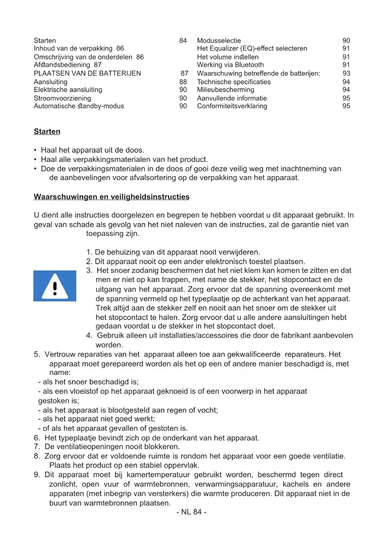 Aansluiting 88 Elektrische aansluiting 90 Stroomvoorziening 90 Automatische andby-modus 90 Modusselectie 90 Het Equalizer (EQ)-eect selecteren 91 Het volume inellen 91 Werking via Bluetooth 91 Waarschuwing betreende de batterijen: 93 Technische specicaties 94 Milieubescherming 94 Aanvullende informatie 95 Conformiteitsverklaring 95- NL 85 -