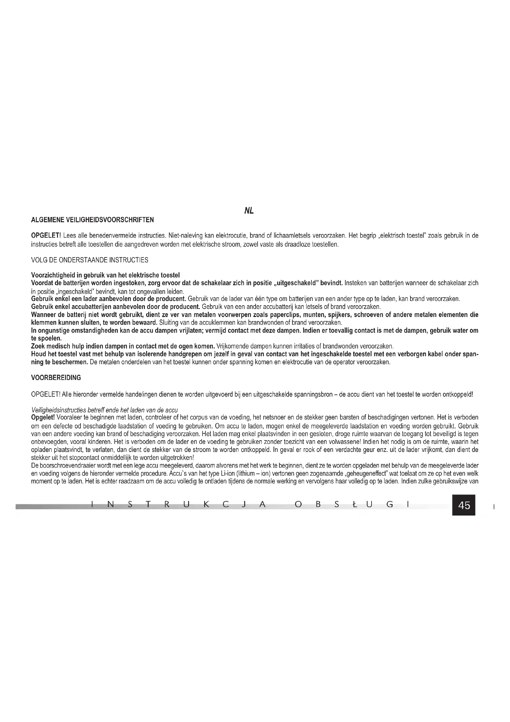 Voorzichtigheid in gebruik van het elektrische toestel Voordat de batterijen worden ingestoken, zorg ervoor dat de schakelaar zich in positie „uitgeschakeld” bevindt. Insteken van batterijen wanneer de schakelaar zich in positie „ingeschakeld” bevindt, kan tot ongevallen leiden. Gebruik enkel een lader aanbevolen door de producent. Gebruik van de lader van één type om batterijen van een ander type op te laden, kan brand veroorzaken. Gebruik enkel accubatterijen aanbevolen door de producent. Gebruik van een ander accubatterij kan letsels of brand veroorzaken. Wanneer de batterij niet wordt gebruikt, dient ze ver van metalen voorwerpen zoals paperclips, munten, spijkers, schroeven of andere metalen elementen die klemmen kunnen sluiten, te worden bewaard. Sluiting van de accuklemmen kan brandwonden of brand veroorzaken. In ongunstige omstandigheden kan de accu dampen vrijlaten; vermijd contact met deze dampen. Indien er toevallig contact is met de dampen, gebruik water om te spoelen. Zoek medisch hulp indien dampen in contact met de ogen komen. Vrijkomende dampen kunnen irritaties of brandwonden veroorzaken. Houd het toestel vast met behulp van isolerende handgrepen om jezelf in geval van contact van het ingeschakelde toestel met een verborgen kabel onder span- ning te beschermen. De metalen onderdelen van het toestel kunnen onder spanning komen en elektrocutie van de operator veroorzaken. VOORBEREIDING OPGELET! Alle hieronder vermelde handelingen dienen te worden uitgevoerd bij een uitgeschakelde spanningsbron – de accu dient van het toestel te worden ontkoppeld! Veiligheidsinstructies betreff ende het laden van de accu Opgelet! Vooraleer te beginnen met laden, controleer of het corpus van de voeding, het netsnoer en de stekker geen barsten of beschadigingen vertonen. Het is verboden om een defecte od beschadigde laadstation of voeding te gebruiken. Om accu te laden, mogen enkel de meegeleverde laadstation en voeding worden gebruikt. Gebruik van een andere voeding kan brand of beschadiging veroorzaken. Het laden mag enkel plaatsvinden in een gesloten, droge ruimte waarvan de toegang tot beveiligd is tegen onbevoegden, vooral kinderen. Het is verboden om de lader en de voeding te gebruiken zonder toezicht van een volwassene! Indien het nodig is om de ruimte, waarin het opladen plaatsvindt, te verlaten, dan dient de stekker van de stroom te worden ontkoppeld. In geval er rook of een verdachte geur enz. uit de lader vrijkomt, dan dient de stekker uit het stopcontact onmiddellijk te worden uitgetrokken! De boorschroevendraaier wordt met een lege accu meegeleverd, daarom alvorens met het werk te beginnen, dient ze te worden opgeladen met behulp van de meegeleverde lader en voeding volgens de hieronder vermelde procedure. Accu`s van het type Li-ion (lithium – ion) vertonen geen zogenaamde „geheugeneff ect” wat toelaat om ze op het even welk moment op te laden. Het is echter raadzaam om de accu volledig te ontladen tijdens de normale werking en vervolgens haar volledig op te laden. Indien zulke gebruikswijze van46