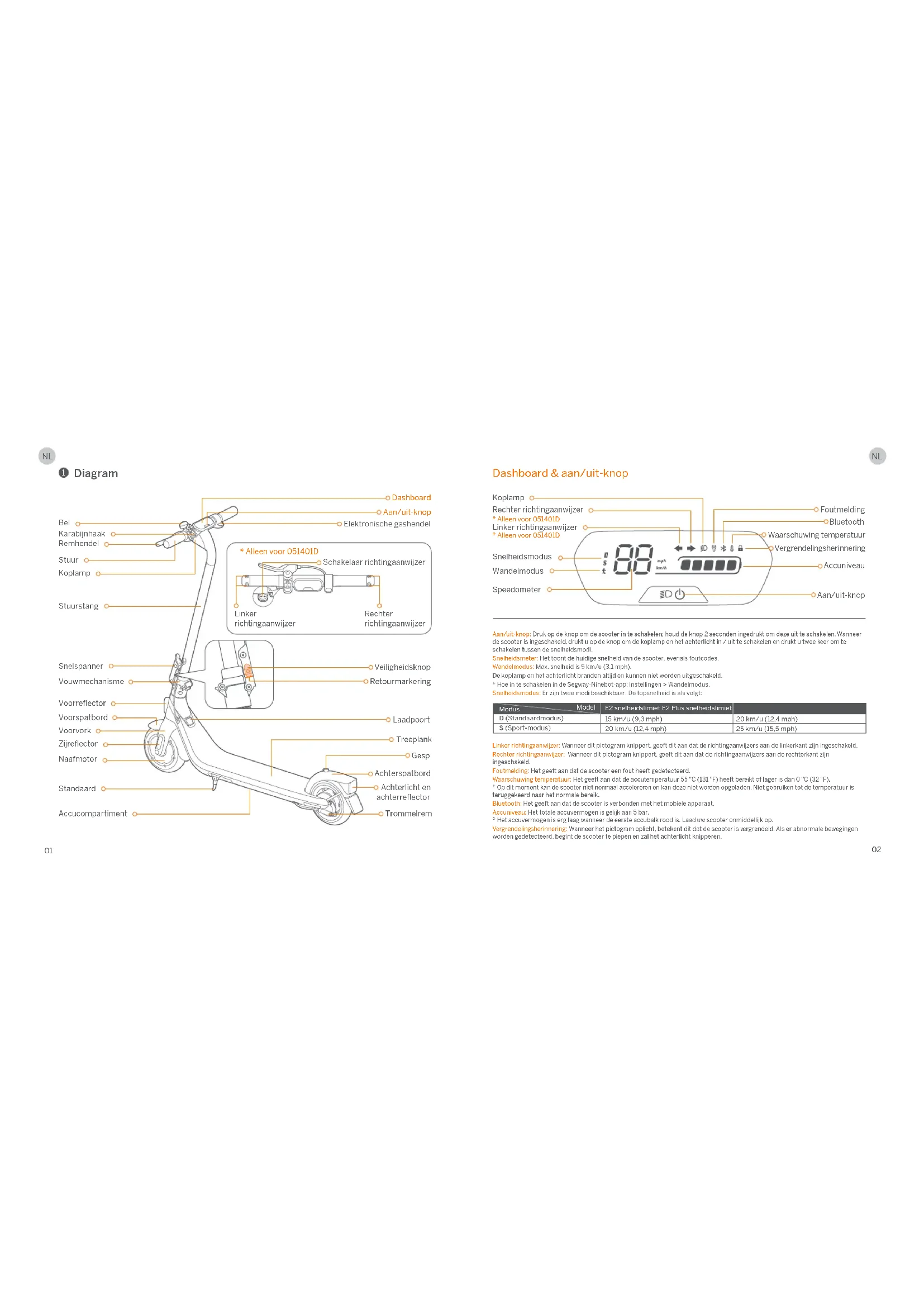 - Alleen voor 051401D Koplamp Foutmelding Accuniveau Aan/uit-knop Model Modus E2 snelheidslimiet E2 Plus snelheidslimiet 15 km/u (9,3 mph) 20 km/u (12,4 mph) 20 km/u (12,4 mph) 25 km/u (15,5 mph) D (Standaardmodus) S (Sport-modus) Bel Stuur Elektronische gashendel Schakelaar richtingaanwijzer Linker richtingaanwijzer Rechter richtingaanwijzer Karabijnhaak Dashboard Remhendel Koplamp Stuurstang Veiligheidsknop Retourmarkering Vouwmechanisme Snelspanner Voorvork Voorspatbord Naafmotor Laadpoort Treeplank Gesp Achterspatbord Trommelrem Zijreflector Voorreflector Standaard Accucompartiment Aan/uit-knop Linker richtingaanwijzer Rechter richtingaanwijzer Achterlicht en achterreflector NLNL