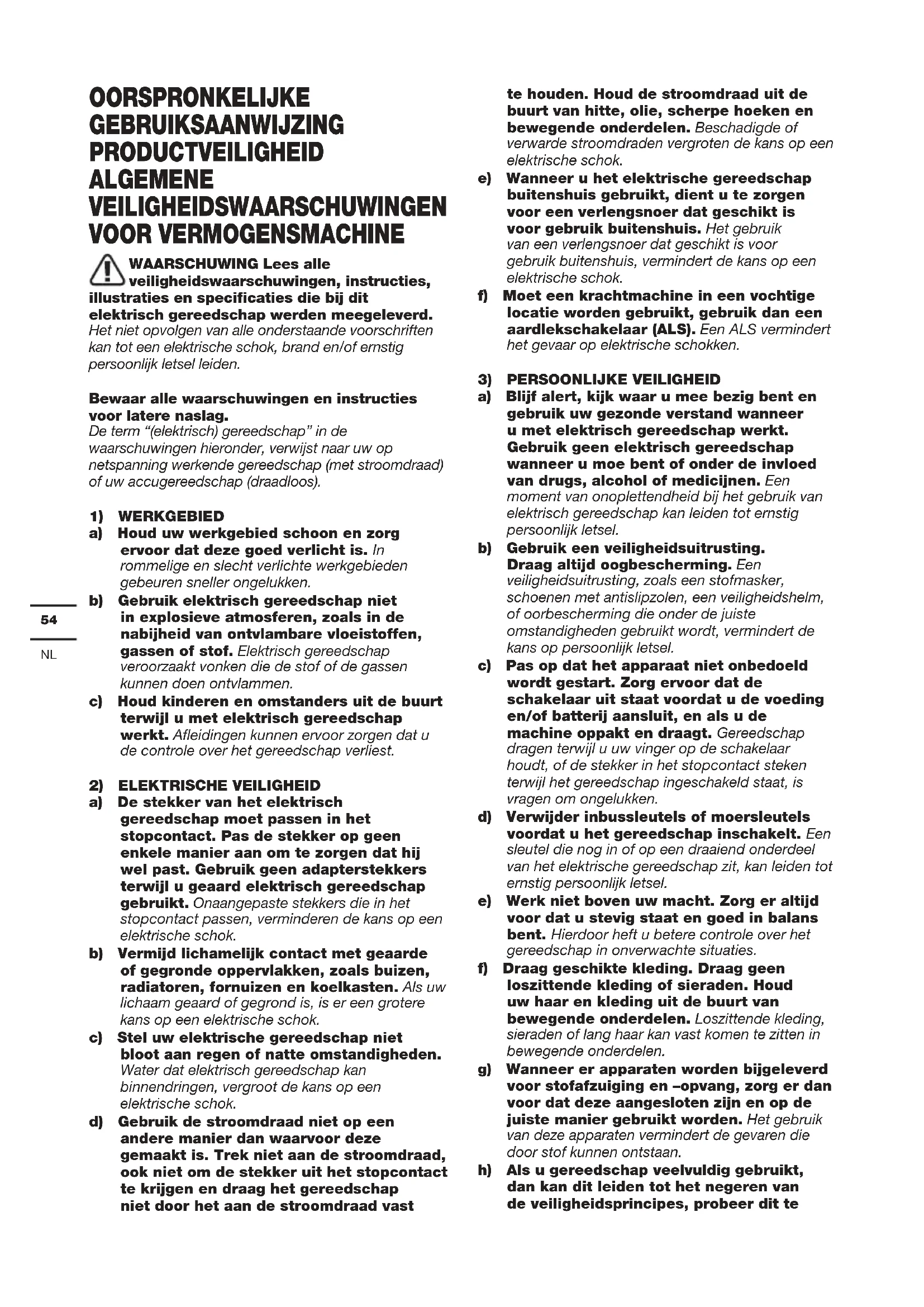 OORSPRONKELIJKE GEBRUIKSAANWIJZING PRODUCTVEILIGHEID ALGEMENE VEILIGHEIDSWAARSCHUWINGEN VOOR VERMOGENSMACHINE WAARSCHUWING Lees alle veiligheidswaarschuwingen, instructies, illustraties en specificaties die bij dit elektrisch gereedschap werden meegeleverd. Het niet opvolgen van alle onderstaande voorschriften kan tot een elektrische schok, brand en/of ernstig persoonlijk letsel leiden. Bewaar alle waarschuwingen en instructies voor latere naslag. De term “(elektrisch) gereedschap” in de waarschuwingen hieronder, verwijst naar uw op netspanning werkende gereedschap (met stroomdraad) of uw accugereedschap (draadloos).