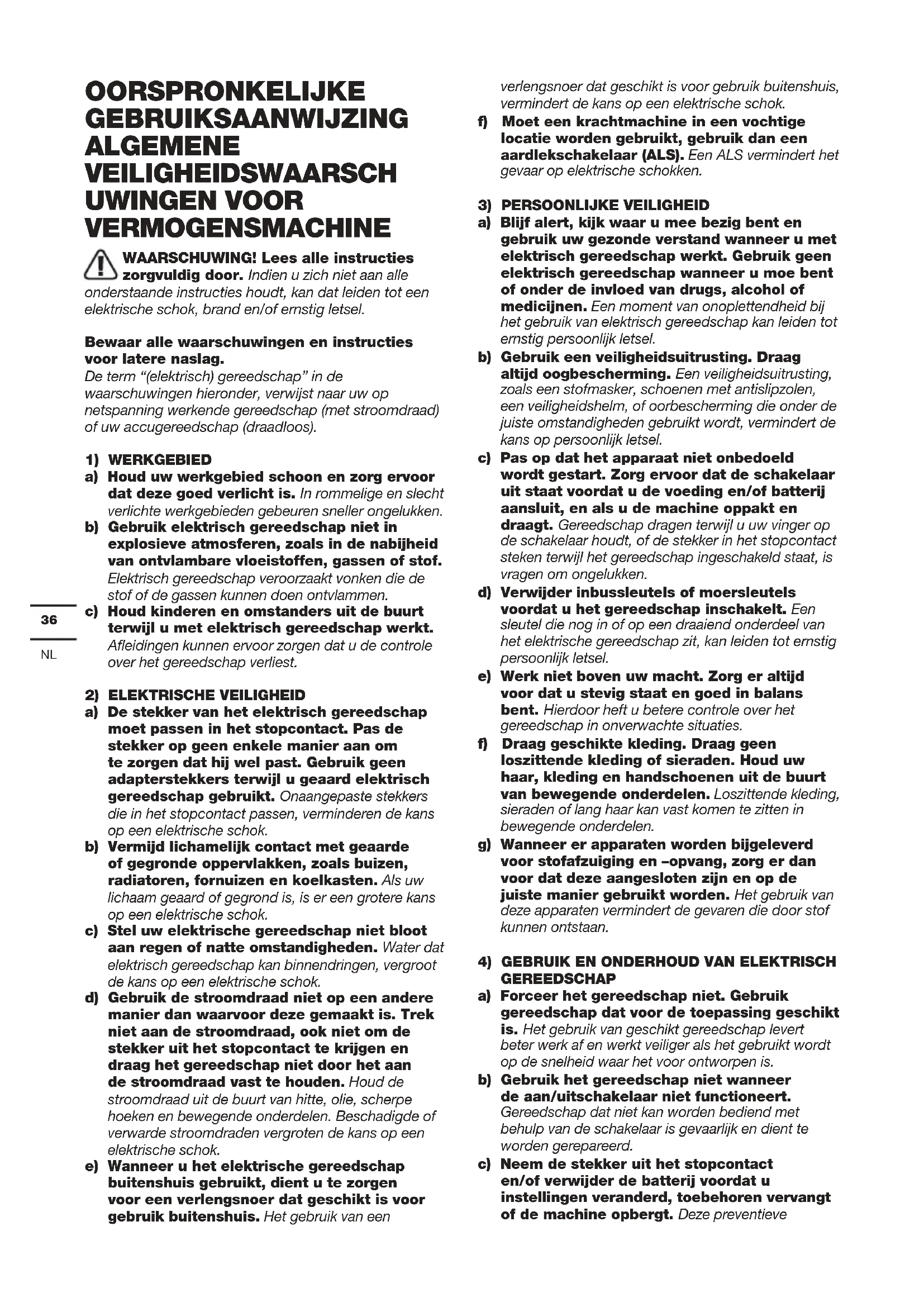 OORSPRONKELIJKE GEBRUIKSAANWIJZING ALGEMENE VEILIGHEIDSWAARSCH UWINGEN VOOR VERMOGENSMACHINE WAARSCHUWING! Lees alle instructies zorgvuldig door. Indien u zich niet aan alle onderstaande instructies houdt, kan dat leiden tot een elektrische schok, brand en/of ernstig letsel. Bewaar alle waarschuwingen en instructies voor latere naslag. De term “(elektrisch) gereedschap” in de waarschuwingen hieronder, verwijst naar uw op netspanning werkende gereedschap (met stroomdraad) of uw accugereedschap (draadloos).