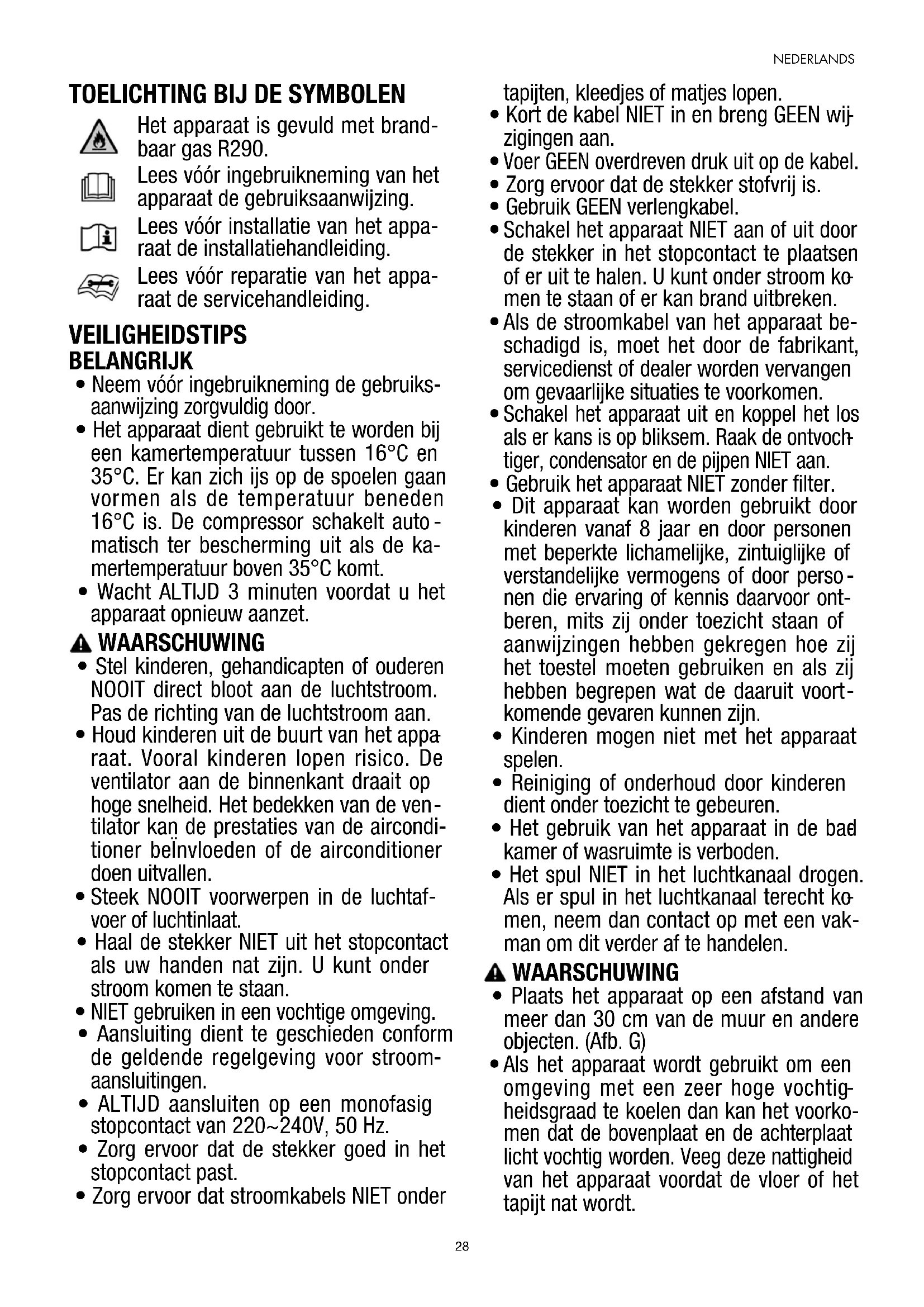 Het apparaat is gevuld met brand- baar gas R290. Lees vóór ingebruikneming van het apparaat de gebruiksaanwijzing. Lees vóór installatie van het appa- raat de installatiehandleiding. Lees vóór reparatie van het appa- raat de servicehandleiding. VEILIGHEIDSTIPS BELANGRIJK