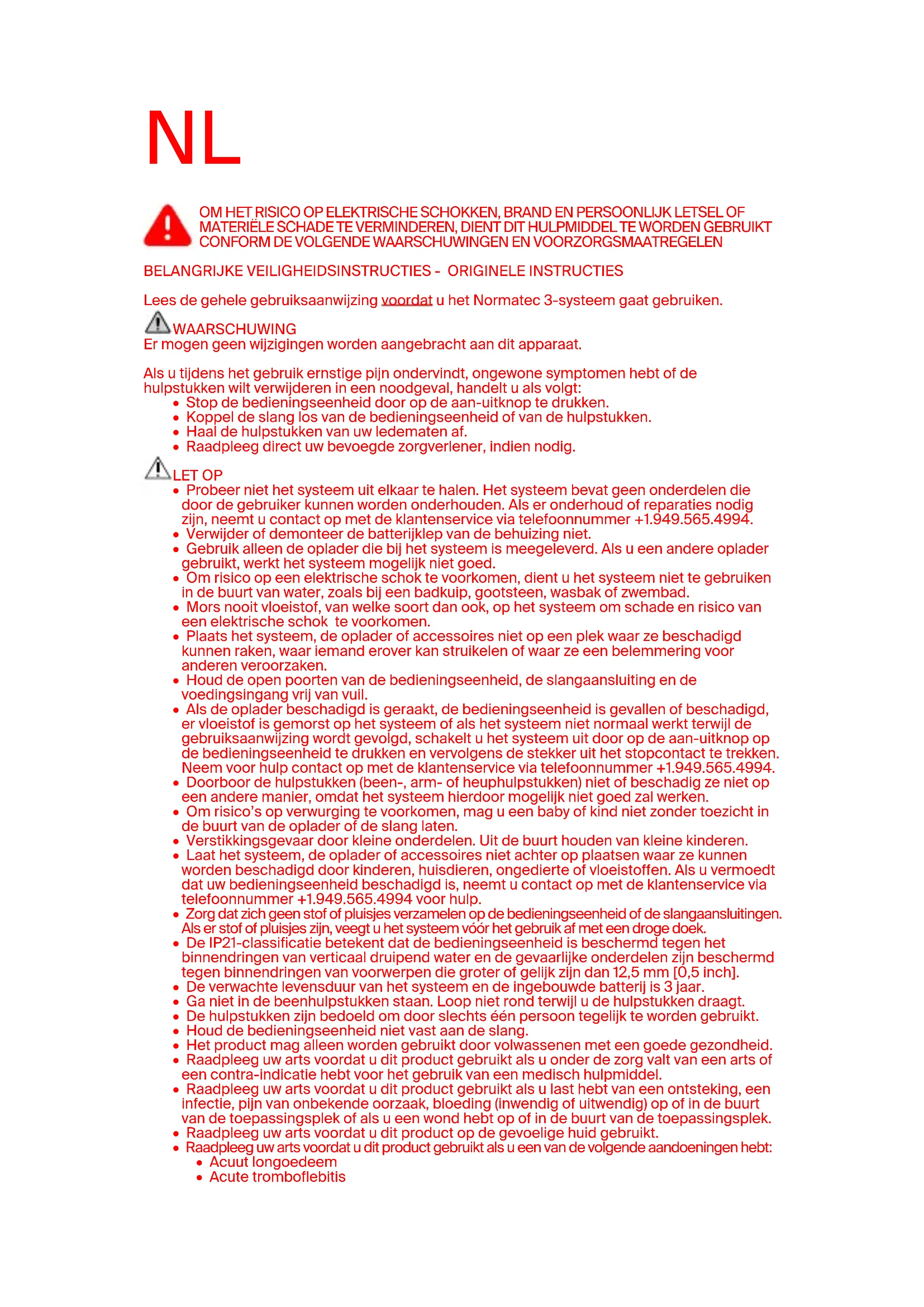 Lees de gehele gebruiksaanwijzing voordat u het Normatec 3-systeem gaat gebruiken. WAARSCHUWING Er mogen geen wijzigingen worden aangebracht aan dit apparaat. Als u tijdens het gebruik ernstige pijn ondervindt, ongewone symptomen hebt of de hulpstukken wilt verwijderen in een noodgeval, handelt u als volgt:
