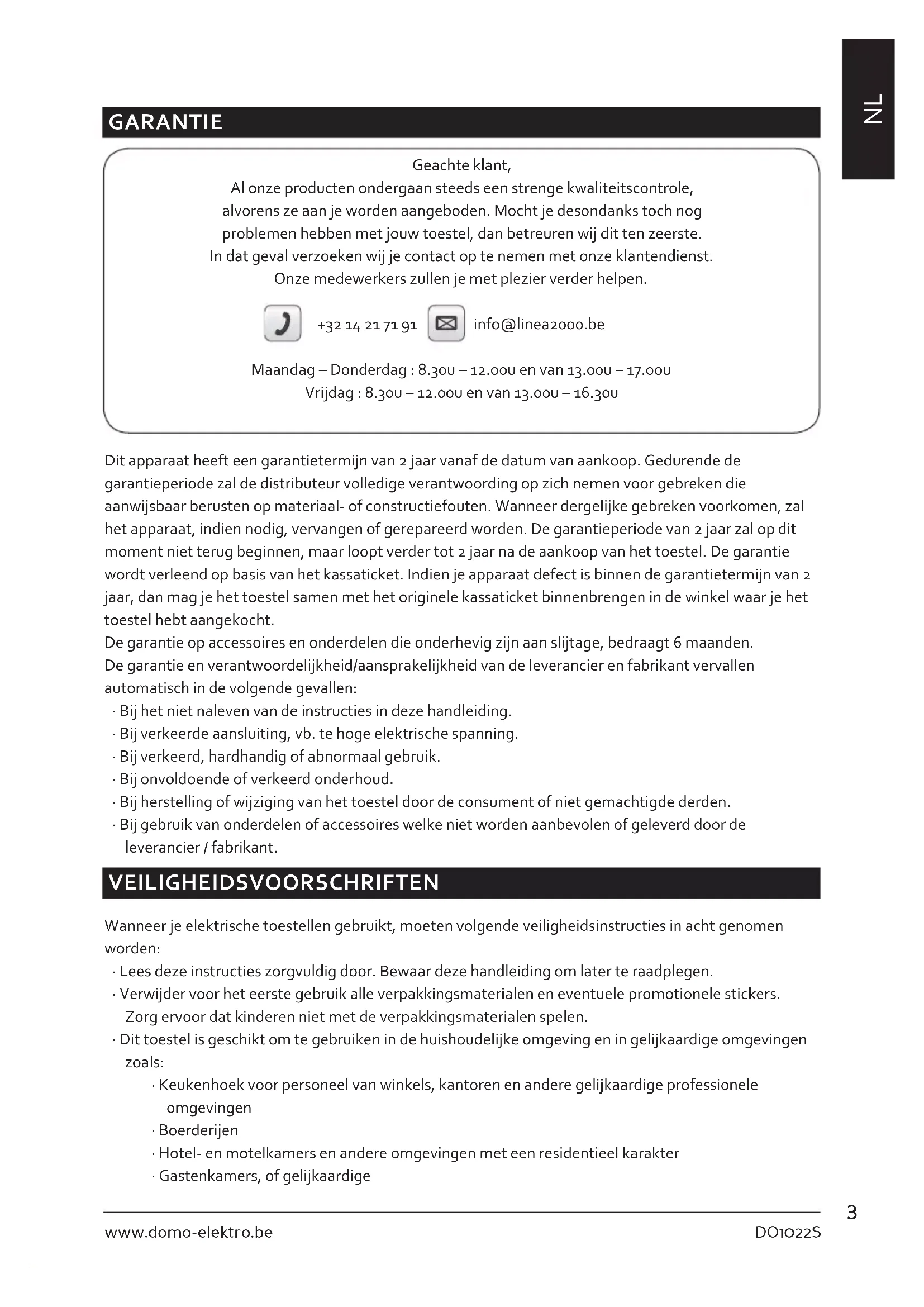 GARANTIE Geachte klant, Al onze producten ondergaan steeds een strenge kwaliteitscontrole, alvorens ze aan je worden aangeboden. Mocht je desondanks toch nog problemen hebben met jouw toestel, dan betreuren wij dit ten zeerste. In dat geval verzoeken wij je contact op te nemen met onze klantendienst. Onze medewerkers zullen je met plezier verder helpen. +32 14 21 71 91 info@linea2000.be Maandag – Donderdag : 8.30u – 12.00u en van 13.00u – 17.00u Vrijdag : 8.30u – 12.00u en van 13.00u – 16.30u Dit apparaat heeft een garantietermijn van 2 jaar vanaf de datum van aankoop. Gedurende de garantieperiode zal de distributeur volledige verantwoording op zich nemen voor gebreken die aanwijsbaar berusten op materiaal- of constructiefouten. Wanneer dergelijke gebreken voorkomen, zal het apparaat, indien nodig, vervangen of gerepareerd worden. De garantieperiode van 2 jaar zal op dit moment niet terug beginnen, maar loopt verder tot 2 jaar na de aankoop van het toestel. De garantie wordt verleend op basis van het kassaticket. Indien je apparaat defect is binnen de garantietermijn van 2 jaar, dan mag je het toestel samen met het originele kassaticket binnenbrengen in de winkel waar je het toestel hebt aangekocht. De garantie op accessoires en onderdelen die onderhevig zijn aan slijtage, bedraagt 6 maanden. De garantie en verantwoordelijkheid/aansprakelijkheid van de leverancier en fabrikant vervallen automatisch in de volgende gevallen: