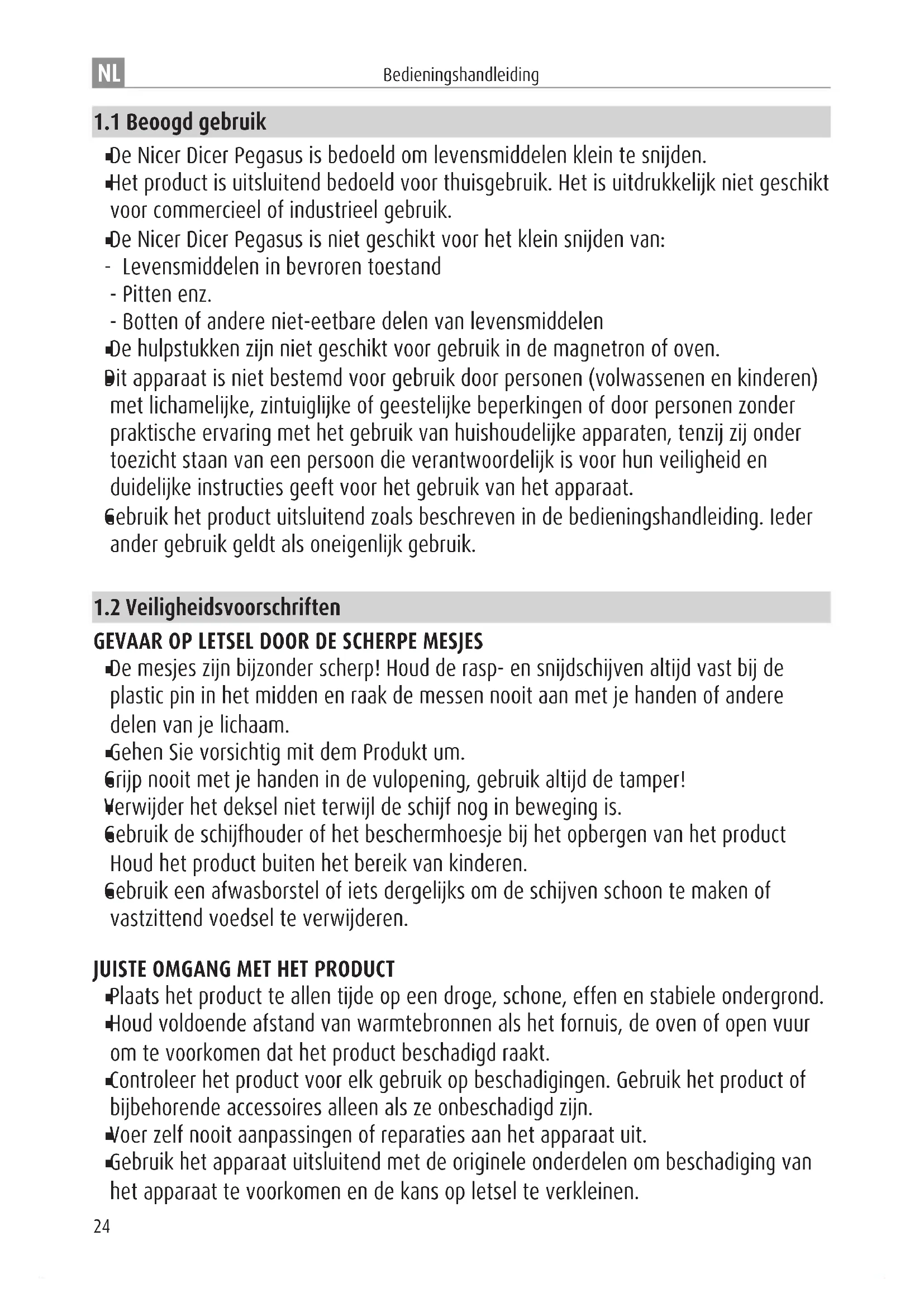 Gebruik het product uitsluitend zoals beschreven in de bedieningshandleiding. Ieder ander gebruik geldt als oneigenlijk gebruik.