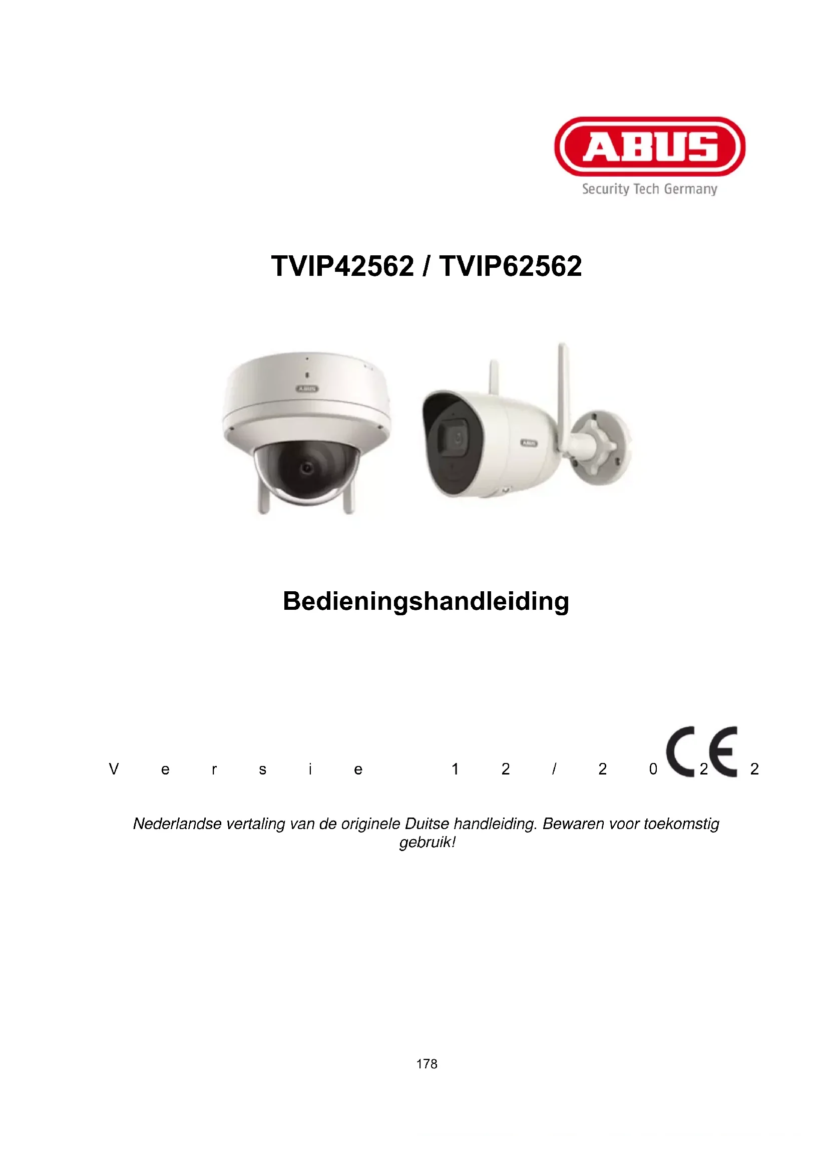 Geachte klant, Hartelijk dank voor de aankoop van dit product. TVIP42562 ABUS Security-Center verklaart hierbij dat het apparaat TVIP42562 voldoet aan de RED-richtlijn 2014/53/EU. Dit apparaat voldoet aan de eisen van de volgende EU-richtlijnen: EMC-richtlijn 2014/30/EU en RoHS-richtlijn 2011/65/EU. De volledige tekst van de EU-conformiteitsverklaring is beschikbaar op het volgende internetadres: www.abus.com/TVIP42562 TVIP62562 ABUS Security-Center verklaart hierbij dat het apparaat TVIP62562 voldoet aan de RED-richtlijn 2014/53/EU. Dit apparaat voldoet aan de eisen van de volgende EU-richtlijnen: EMC-richtlijn 2014/30/EU en RoHS-richtlijn 2011/65/EU. De volledige tekst van de EU-conformiteitsverklaring is beschikbaar op het volgende internetadres: www.abus.com/TVIP62562