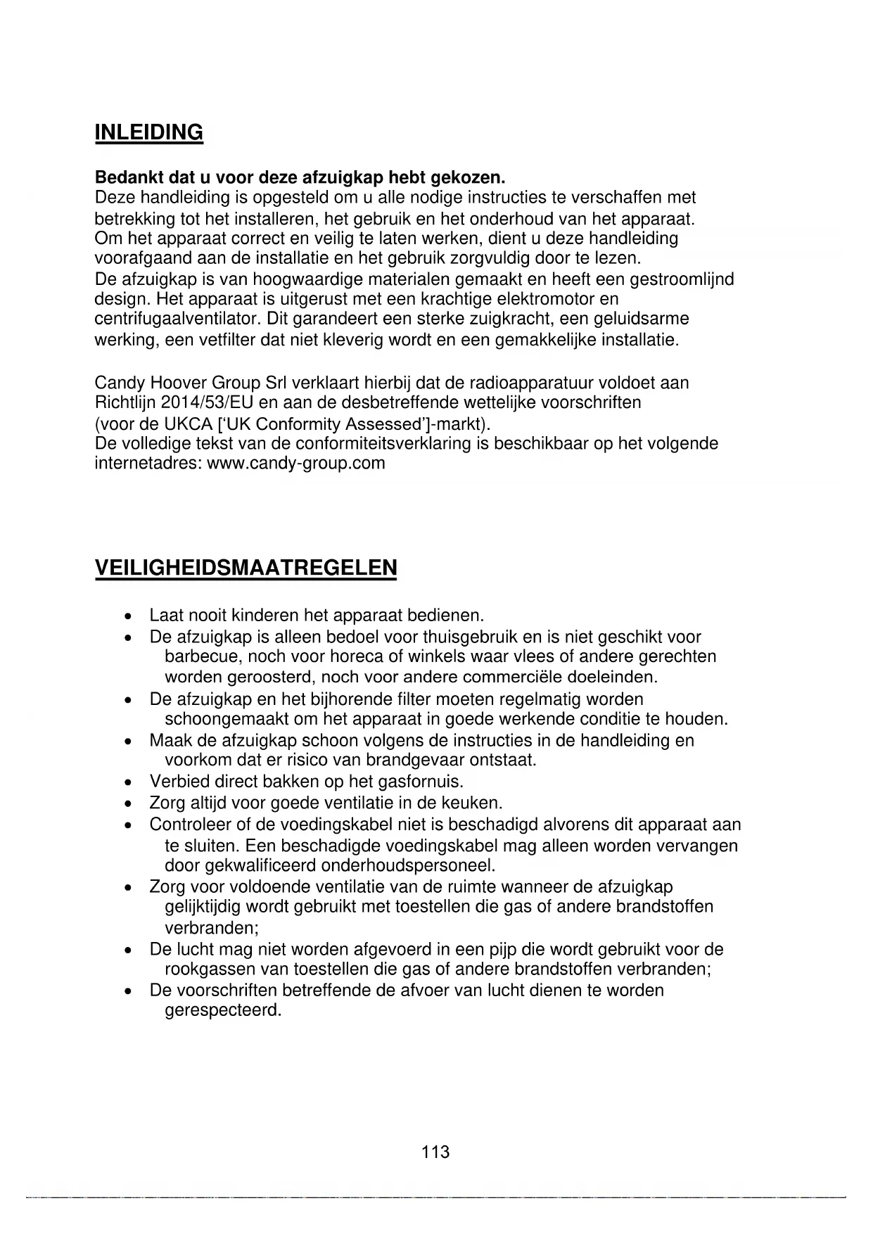 112INLEIDING Bedankt dat u voor deze afzuigkap hebt gekozen. Deze handleiding is opgesteld om u alle nodige instructies te verschaffen met betrekking tot het installeren, het gebruik en het onderhoud van het apparaat. Om het apparaat correct en veilig te laten werken, dient u deze handleiding voorafgaand aan de installatie en het gebruik zorgvuldig door te lezen. De afzuigkap is van hoogwaardige materialen gemaakt en heeft een gestroomlijnd design. Het apparaat is uitgerust met een krachtige elektromotor en centrifugaalventilator. Dit garandeert een sterke zuigkracht, een geluidsarme werking, een vetfilter dat niet kleverig wordt en een gemakkelijke installatie. Candy Hoover Group Srl verklaart hierbij dat de radioapparatuur voldoet aan Richtlijn 2014/53/EU en aan de desbetreffende wettelijke voorschriften (voor de UKCA [‘UK Conformity Assessed’]-markt). De volledige tekst van de conformiteitsverklaring is beschikbaar op het volgende internetadres: www.candy-group.com VEILIGHEIDSMAATREGELEN