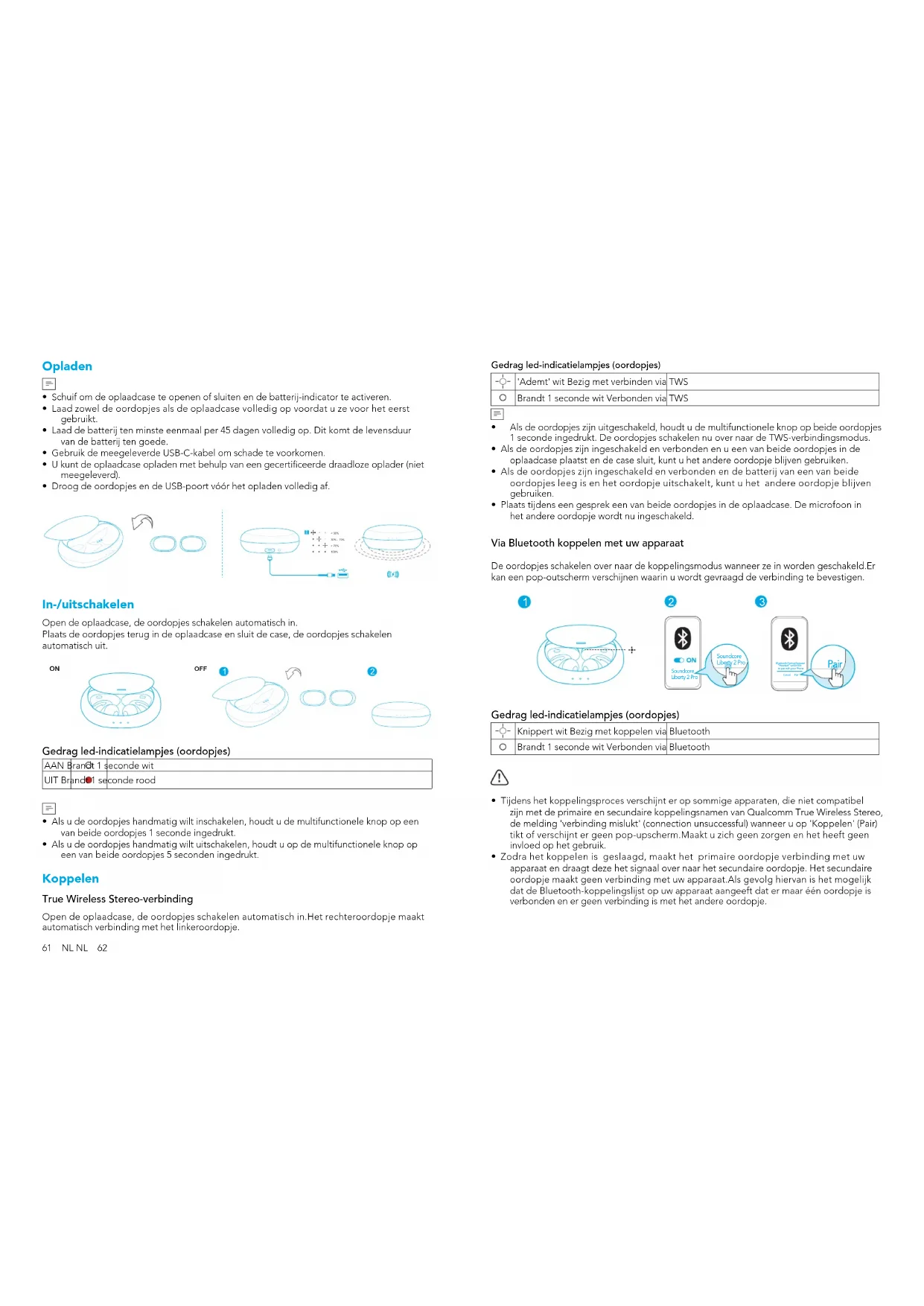 - Als u de oordopjes handmatig wilt uitschakelen, houdt u op de multifunctionele knop op een van beide oordopjes 5 seconden ingedrukt. Koppelen True Wireless Stereo-verbinding Open de oplaadcase, de oordopjes schakelen automatisch in.Het rechteroordopje maakt automatisch verbinding met het linkeroordopje. Gedrag led-indicatielampjes (oordopjes) 'Ademt' wit Bezig met verbinden via TWS Brandt 1 seconde wit Verbonden via TWS