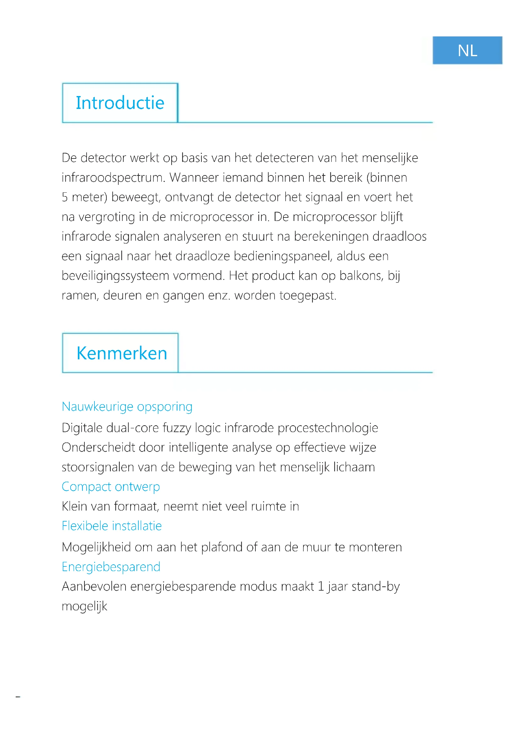 De detector werkt op basis van het detecteren van het menselijkke infraroodspeurom. Wonneer iemand binnen het bereik (binnen 5 meter) beweegt, ontvangt de detector het signaal en voert het na vergroting in de microprocessor in. De microprocessor blijt infrarode signalen analyseren en stuart na berekeningen draadloos een signaal waar het draadloze bedieningspaneel, aldus een beveiligingssystem vormend. Het product kan op balkons, bij ramen, deuren en gangen enz. worden toegepast.