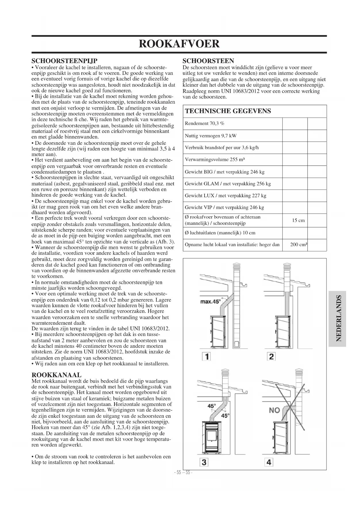 NEDERLANDS TECHNISCHE GEGEVENS Rendement 70,3 % Nuttig vermogen 9,7 kW Verbruik brandstof per uur 3,6 kg/h Verwarmingsvolume 255 m³ Gewicht BIG / met verpakking 246 kg Gewicht GLAM / met verpakking 256 kg Gewicht LUX / met verpakking 227 kg Gewicht VIP / met verpakking 246 kg Ø rookafvoer bovenaan of achteraan (mannelijk) / schoorsteenpijp 15 cm Ø luchtuitlaten (mannelijk) 10 cm Opname lucht lokaal van installatie: hoger dan 200 cm² SCHOORSTEENPIJP