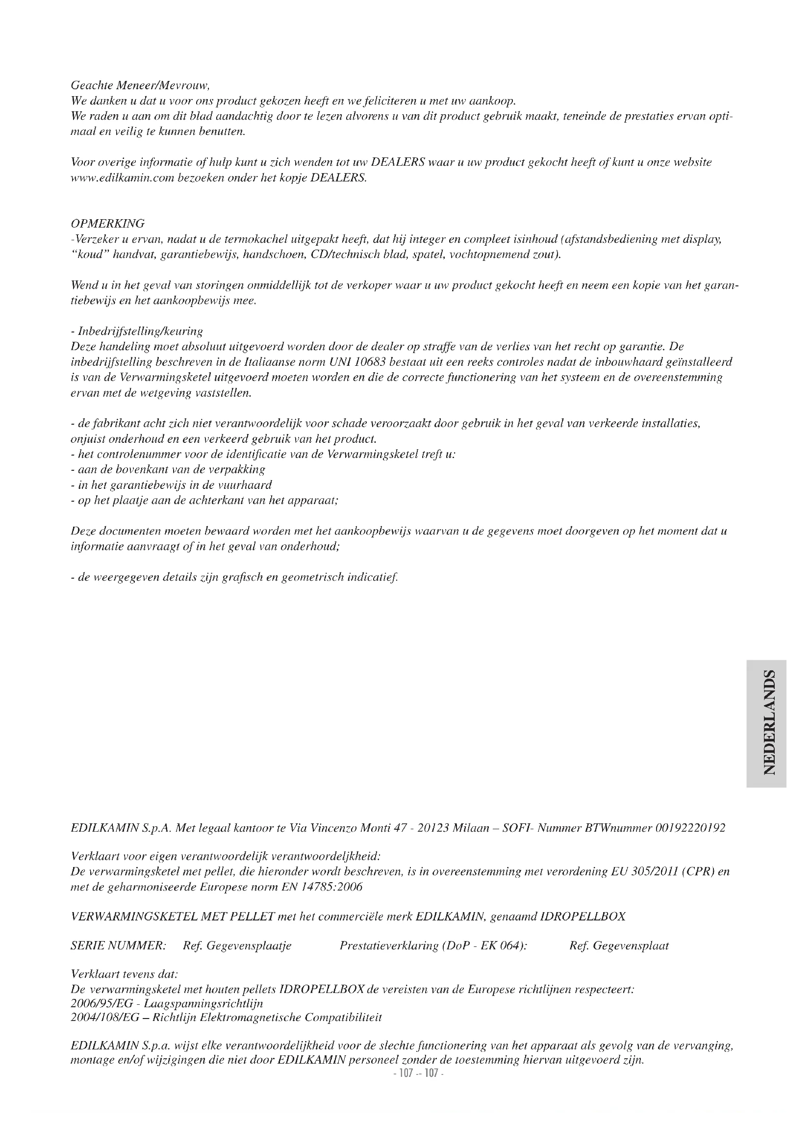 NEIN. Der Wassergeführter-Kamin wurde für die Verbrennung von Pellet von 6 mm Durchmesser gebaut, anderes Material könn- te ihn beschädigen.- 107 -- 107 - NEDERLANDS Geachte Meneer/Mevrouw, We danken u dat u voor ons product gekozen heeft en we feliciteren u met uw aankoop. We raden u aan om dit blad aandachtig door te lezen alvorens u van dit product gebruik maakt, teneinde de prestaties ervan opti- maal en veilig te kunnen benutten. Voor overige informatie of hulp kunt u zich wenden tot uw DEALERS waar u uw product gekocht heeft of kunt u onze website www.edilkamin.com bezoeken onder het kopje DEALERS. OPMERKING -Verzeker u ervan, nadat u de termokachel uitgepakt heeft, dat hij integer en compleet isinhoud (afstandsbediening met display, “koud” handvat, garantiebewijs, handschoen, CD/technisch blad, spatel, vochtopnemend zout). Wend u in het geval van storingen onmiddellijk tot de verkoper waar u uw product gekocht heeft en neem een kopie van het garan- tiebewijs en het aankoopbewijs mee. - Inbedrijfstelling/keuring Deze handeling moet absoluut uitgevoerd worden door de dealer op straffe van de verlies van het recht op garantie. De inbedrijfstelling beschreven in de Italiaanse norm UNI 10683 bestaat uit een reeks controles nadat de inbouwhaard geïnstalleerd is van de Verwarmingsketel uitgevoerd moeten worden en die de correcte functionering van het systeem en de overeenstemming ervan met de wetgeving vaststellen. - de fabrikant acht zich niet verantwoordelijk voor schade veroorzaakt door gebruik in het geval van verkeerde installaties, onjuist onderhoud en een verkeerd gebruik van het product. - het controlenummer voor de identifi catie van de Verwarmingsketel treft u: - aan de bovenkant van de verpakking - in het garantiebewijs in de vuurhaard - op het plaatje aan de achterkant van het apparaat; Deze documenten moeten bewaard worden met het aankoopbewijs waarvan u de gegevens moet doorgeven op het moment dat u informatie aanvraagt of in het geval van onderhoud; - de weergegeven details zijn grafi sch en geometrisch indicatief. EDILKAMIN S.p.A. Met legaal kantoor te Via Vincenzo Monti 47 - 20123 Milaan – SOFI- Nummer BTWnummer 00192220192 Verklaart voor eigen verantwoordelijk verantwoordeljkheid: De verwarmingsketel met pellet, die hieronder wordt beschreven, is in overeenstemming met verordening EU 305/2011 (CPR) en met de geharmoniseerde Europese norm EN 14785:2006 VERWARMINGSKETEL MET PELLET met het commerciële merk EDILKAMIN, genaamd IDROPELLBOX SERIE NUMMER: Ref. Gegevensplaatje Prestatieverklaring (DoP - EK 064): Ref. Gegevensplaat Verklaart tevens dat: