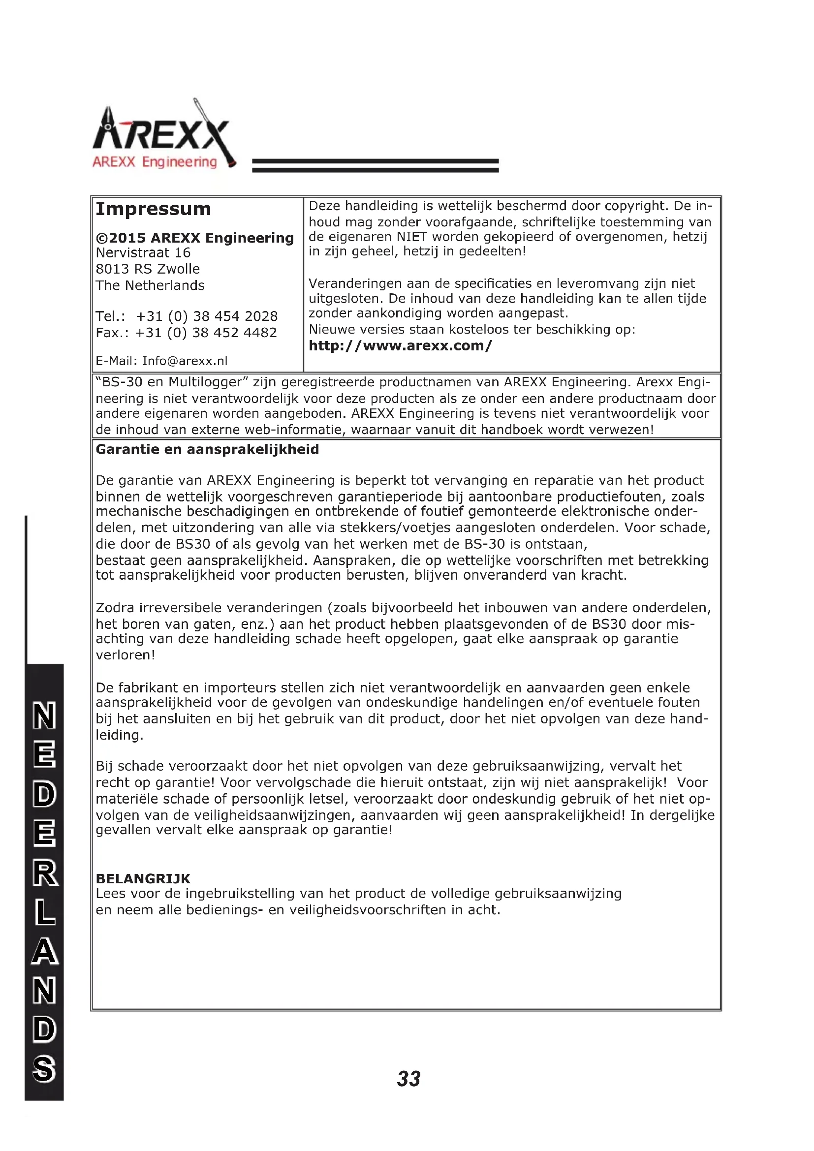 | "BS-30 en Multilogger" zijn geregistreerde productnamen van AREXX Engineering. Arexx Engineering is niet verantwoordelijk voor deze producten als ze onder een andere productnaam door andere eigenaren worden aangeboden. AREXX Engineering is tevens niet verantwoordelijk voor de inhoud van externe web-informatie, waarnaar vanuit dit handboek wordt verwezen! | |