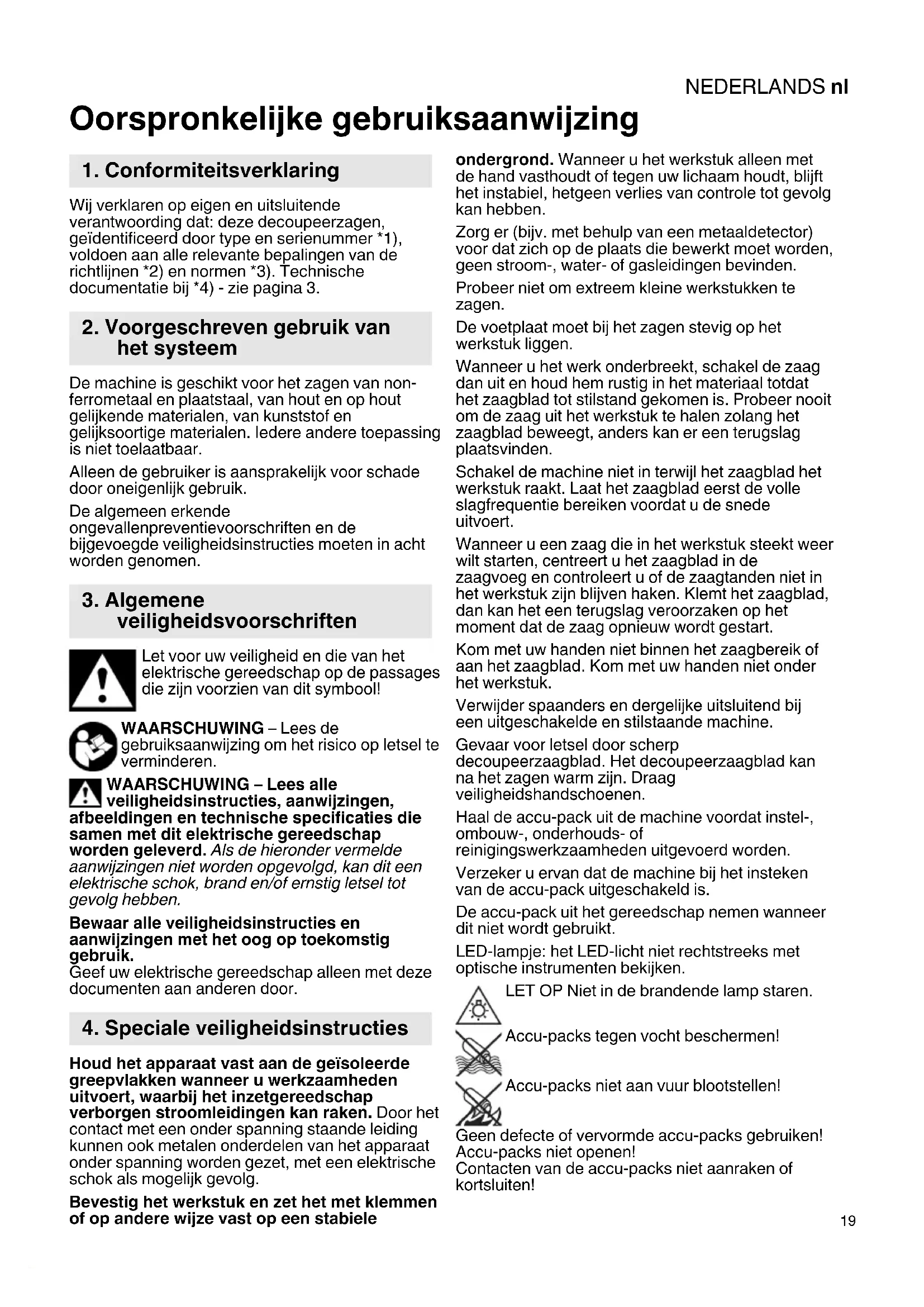 Oorspronkelijke gebruiksaanwijzing Wij verklaren op eigen en uitsluitende verantwoording dat: deze decoupeerzagen, geïdentificeerd door type en serienummer *1), voldoen aan alle relevante bepalingen van de richtlijnen *2) en normen *3). Technische documentatie bij *4) - zie pagina 3. De machine is geschikt voor het zagen van non- ferrometaal en plaatstaal, van hout en op hout gelijkende materialen, van kunststof en gelijksoortige materialen. Iedere andere toepassing is niet toelaatbaar. Alleen de gebruiker is aansprakelijk voor schade door oneigenlijk gebruik. De algemeen erkende ongevallenpreventievoorschriften en de bijgevoegde veiligheidsinstructies moeten in acht worden genomen. Let voor uw veiligheid en die van het elektrische gereedschap op de passages die zijn voorzien van dit symbool! WAARSCHUWING – Lees de gebruiksaanwijzing om het risico op letsel te verminderen. WAARSCHUWING – Lees alle veiligheidsinstructies, aanwijzingen, afbeeldingen en technische specificaties die samen met dit elektrische gereedschap worden geleverd. Als de hieronder vermelde aanwijzingen niet worden opgevolgd, kan dit een elektrische schok, brand en/of ernstig letsel tot gevolg hebben. Bewaar alle veiligheidsinstructies en aanwijzingen met het oog op toekomstig gebruik. Geef uw elektrische gereedschap alleen met deze documenten aan anderen door. Houd het apparaat vast aan de geïsoleerde greepvlakken wanneer u werkzaamheden uitvoert, waarbij het inzetgereedschap verborgen stroomleidingen kan raken. Door het contact met een onder spanning staande leiding kunnen ook metalen onderdelen van het apparaat onder spanning worden gezet, met een elektrische schok als mogelijk gevolg. Bevestig het werkstuk en zet het met klemmen of op andere wijze vast op een stabiele ondergrond. Wanneer u het werkstuk alleen met de hand vasthoudt of tegen uw lichaam houdt, blijft het instabiel, hetgeen verlies van controle tot gevolg kan hebben. Zorg er (bijv. met behulp van een metaaldetector) voor dat zich op de plaats die bewerkt moet worden, geen stroom-, water- of gasleidingen bevinden. Probeer niet om extreem kleine werkstukken te zagen. De voetplaat moet bij het zagen stevig op het werkstuk liggen. Wanneer u het werk onderbreekt, schakel de zaag dan uit en houd hem rustig in het materiaal totdat het zaagblad tot stilstand gekomen is. Probeer nooit om de zaag uit het werkstuk te halen zolang het zaagblad beweegt, anders kan er een terugslag plaatsvinden. Schakel de machine niet in terwijl het zaagblad het werkstuk raakt. Laat het zaagblad eerst de volle slagfrequentie bereiken voordat u de snede uitvoert. Wanneer u een zaag die in het werkstuk steekt weer wilt starten, centreert u het zaagblad in de zaagvoeg en controleert u of de zaagtanden niet in het werkstuk zijn blijven haken. Klemt het zaagblad, dan kan het een terugslag veroorzaken op het moment dat de zaag opnieuw wordt gestart. Kom met uw handen niet binnen het zaagbereik of aan het zaagblad. Kom met uw handen niet onder het werkstuk. Verwijder spaanders en dergelijke uitsluitend bij een uitgeschakelde en stilstaande machine. Gevaar voor letsel door scherp decoupeerzaagblad. Het decoupeerzaagblad kan na het zagen warm zijn. Draag veiligheidshandschoenen. Haal de accu-pack uit de machine voordat instel-, ombouw-, onderhouds- of reinigingswerkzaamheden uitgevoerd worden. Verzeker u ervan dat de machine bij het insteken van de accu-pack uitgeschakeld is. De accu-pack uit het gereedschap nemen wanneer dit niet wordt gebruikt. LED-lampje: het LED-licht niet rechtstreeks met optische instrumenten bekijken. LET OP Niet in de brandende lamp staren. Accu-packs tegen vocht beschermen! Accu-packs niet aan vuur blootstellen! Geen defecte of vervormde accu-packs gebruiken! Accu-packs niet openen! Contacten van de accu-packs niet aanraken of kortsluiten!