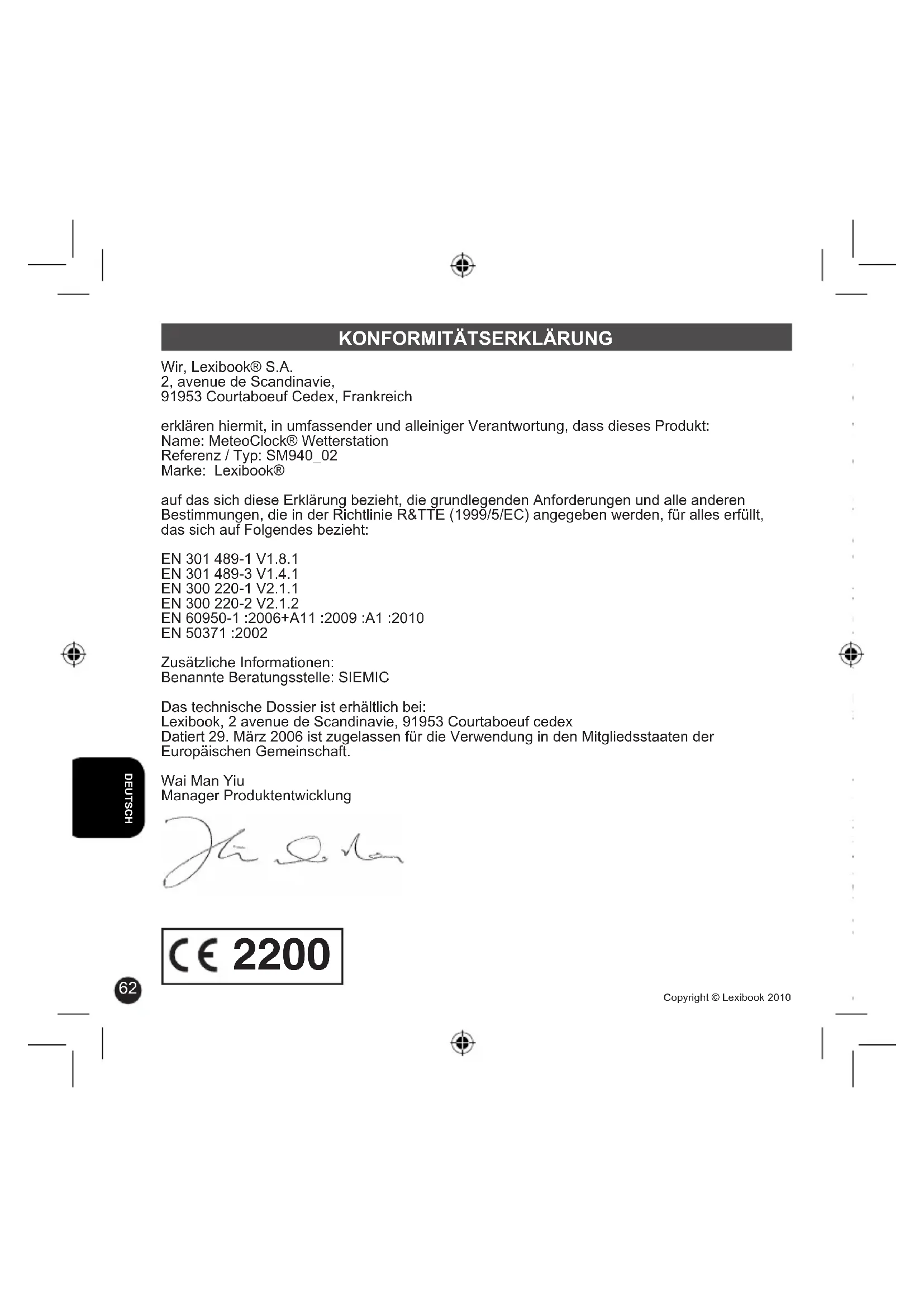 Copyright © Lexibook 2010 CONFORMITEITSVERKLARING We, Lexibook® S.A. 2, avenue de Scandinavie 91953 Courtaboeuf Cedex, Frankrijk verklaart hierbij op onze volledig eigen verantwoordelijkheid dat het product: Naam: MeteoClock® weerstation Referentie / type: SM940_02 Merk: Lexibook® waar deze verklaring naar toe verwijst, voldoet aan de essentiële eisen en andere bepalingen die in Richtlijn R&TTE (1999/5/EC) zijn vermeld voor wat betreft de: EN 301 489-1 V1.8.1 EN 301 489-3 V1.4.1 EN 300 220-1 V2.1.1 EN 300 220-2 V2.1.2 EN 60950-1 :2006+A11 :2009 :A1 :2010 EN 50371 :2002 Extra informatie: Geraadpleegd bevoegd laboratorium: SIEMIC Technisch rapport beschikbaar op: Lexibook, 2 avenue de Scandinavie, 91953 Courtaboeuf cedex Gedateerd op 29 maart 2006 is geschikt voor gebruik binnen de landen van de Europese Gemeenschap. Wai Man Yiu Verantwoordelijke Productontwikkeling SM940_02IM1330 2200Copyright © Lexibook 2010 CONFORMITEITSVERKLARING We, Lexibook® S.A. 2, avenue de Scandinavie 91953 Courtaboeuf Cedex, Frankrijk verklaart hierbij op onze volledig eigen verantwoordelijkheid dat het product: Naam: MeteoClock® weerstation Referentie / type: SM940_02 Merk: Lexibook® waar deze verklaring naar toe verwijst, voldoet aan de essentiële eisen en andere bepalingen die in Richtlijn R&TTE (1999/5/EC) zijn vermeld voor wat betreft de: EN 301 489-1 V1.8.1 EN 301 489-3 V1.4.1 EN 300 220-1 V2.1.1 EN 300 220-2 V2.1.2 EN 60950-1 :2006+A11 :2009 :A1 :2010 EN 50371 :2002 Extra informatie: Geraadpleegd bevoegd laboratorium: SIEMIC Technisch rapport beschikbaar op: Lexibook, 2 avenue de Scandinavie, 91953 Courtaboeuf cedex Gedateerd op 29 maart 2006 is geschikt voor gebruik binnen de landen van de Europese Gemeenschap. Wai Man Yiu Verantwoordelijke Productontwikkeling SM940_02IM1330