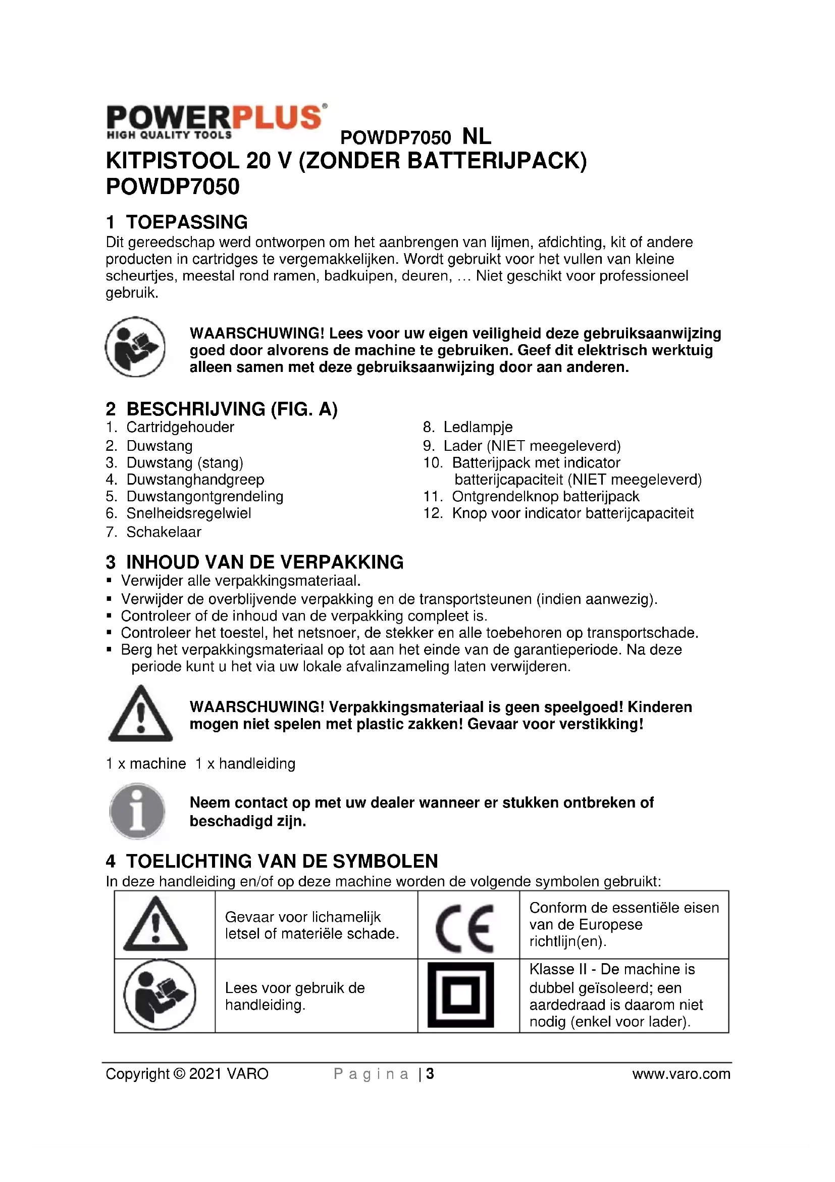 Klasse II - De machine is dubbel geïsoleerd; een aardedraad is daarom niet nodig (enkel voor lader).POWDP7050 NL Copyright © 2021 VARO P a g i n a | 4 www.varo.com