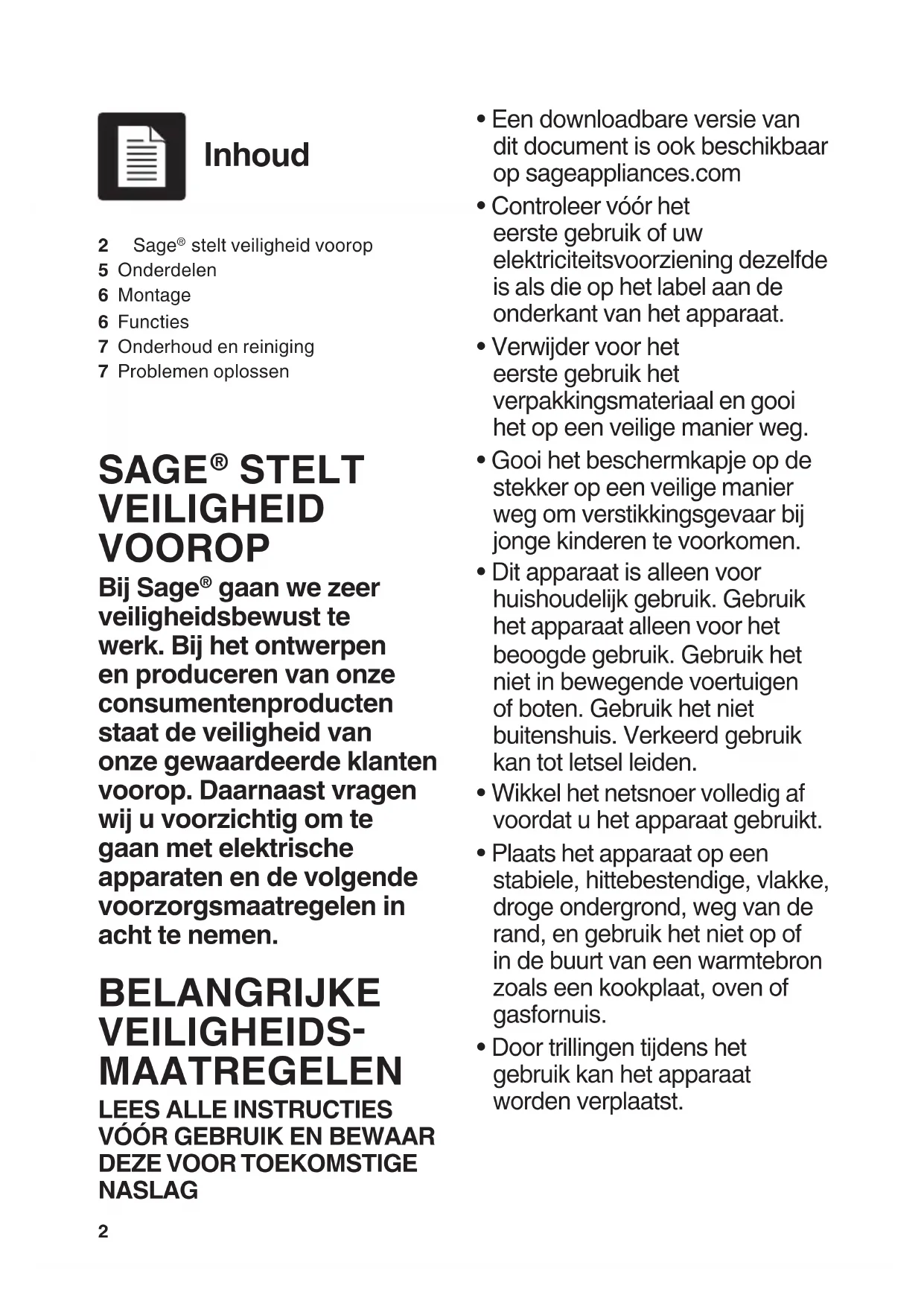 - Door trillingen tijdens het gebruik kan het apparaat worden verplaatst. 2 Sage stelt veiligheid voorop 5 Onderdelen6 Montage6 Functies7 Onderhoud en reiniging7 Problemen oplossen SAGE