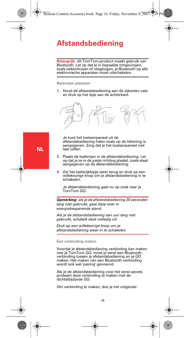 Remote-Control-Accessory.book Page 16 Friday, November 9, 2007 4:19 PM Afstandsbediening Afstandsbediening Belangrijk: dit TomTom-product maakt gebruik van Bluetooth. Let op dat je in bepaalde omgevingen, zoals ziekenhuizen of vliegtuigen, je Bluetooth op alle elektronische apparaten moet uitschakelen. Batterijen plaatsen