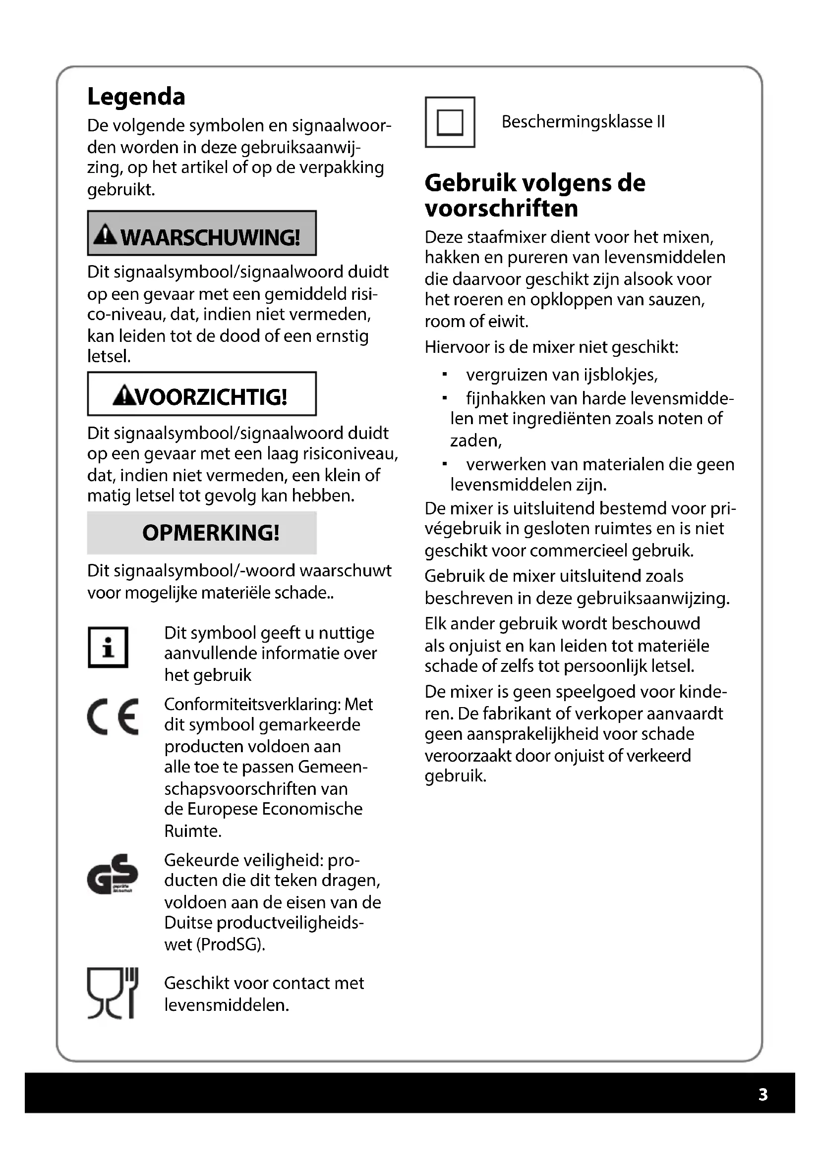 - Garantiekaart Veiligheid De handleiding lezen en bewaren Lees de volgende aanwijzingen aandachtig door en bewaar deze gebruiksaanwijzing, voor het geval u later iets wilt nalezen. Als u het artikel aan iemand anders doorgeeft, doe er dan ook deze gebruiksaanwijzing bij.3 Legenda De volgende symbolen en signaalwoor- den worden in deze gebruiksaanwij- zing, op het artikel of op de verpakking gebruikt. WAARSCHUWING! Dit signaalsymbool/signaalwoord duidt op een gevaar met een gemiddeld risi- co-niveau, dat, indien niet vermeden, kan leiden tot de dood of een ernstig letsel. VOORZICHTIG! Dit signaalsymbool/signaalwoord duidt op een gevaar met een laag risiconiveau, dat, indien niet vermeden, een klein of matig letsel tot gevolg kan hebben. OPMERKING! Dit signaalsymbool/-woord waarschuwt voor mogelijke materiële schade Dit symbool geeft u nuttige aanvullende informatie over het gebruik Conformiteitsverklaring: Met dit symbool gemarkeerde producten voldoen aan alle toe te passen Gemeen- schapsvoorschriften van de Europese Economische Ruimte. Gekeurde veiligheid: pro- ducten die dit teken dragen, voldoen aan de eisen van de Duitse productveiligheids- wet (ProdSG). Geschikt voor contact met levensmiddelen. Beschermingsklasse II Gebruik volgens de voorschriften Deze staafmixer dient voor het mixen, hakken en pureren van levensmiddelen die daarvoor geschikt zijn alsook voor het roeren en opkloppen van sauzen, room of eiwit. Hiervoor is de mixer niet geschikt: vergruizen van ijsblokjes, fijnhakken van harde levensmidde- len met ingrediënten zoals noten of zaden, verwerken van materialen die geen levensmiddelen zijn. De mixer is uitsluitend bestemd voor pri- végebruik in gesloten ruimtes en is niet geschikt voor commercieel gebruik. Gebruik de mixer uitsluitend zoals beschreven in deze gebruiksaanwijzing. Elk ander gebruik wordt beschouwd als onjuist en kan leiden tot materiële schade of zelfs tot persoonlijk letsel. De mixer is geen speelgoed voor kinde- ren. De fabrikant of verkoper aanvaardt geen aansprakelijkheid voor schade veroorzaakt door onjuist of verkeerd gebruik.4 Veiligheidsvoorschriften WAARSCHUWING! Gevaar voor een elektrische schok! Een onjuiste elektrische installatie, te hoge netspanning en een onjuiste behandeling van een elektrisch appa- raat kunnen leiden tot een elektrische schok. Voor het mixen en kloppen worden de pureerstaaf en de garde van het apparaat ook in vloeisto en gedom- peld. Dompel het apparaat zelf, het netsnoer en de netstekker echter nooit onder in water of een andere vloeistof want dan bestaat er gevaar voor elektrische schokken. Gebruik het apparaat niet in een vochtige omgeving of een omge- ving met een hoge luchtvochtig- heidsgraad. Sluit het apparaat aan op een op de juiste manier geïnstalleerd stopcon- tact waarvan de spanning voldoet aan de ‚Technische gegevens‘. Let erop, dat het stopcontact goed toegankelijk is zodat u de netstek- ker er zo nodig snel kunt uittrekken. Gebruik de mixer niet als het appa- raat, het netsnoer of de netstekker beschadigd zijn of als het apparaat gevallen is, als er duidelijke schade is of als het lekt. Let erop dat het netsnoer niet door scherpe randen of hete voorwerpen wordt beschadigd. Bedien de mixer niet met natte handen. Trek de netstekker uit het stopcon- tact als u de mixer niet gebruikt, voordat u het schoonmaakt of monteert, verplaatst of opbergt en bij duidelijke problemen tijdens het gebruik en bij onweer. Trek daarbij steeds aan de netstekker, niet aan het netsnoer. Wikkel het netsnoer niet om de mixer. Gebruik geen verlengsnoer. Wijzig niets aan het apparaat of aan het netsnoer. Laat reparaties alleen door een vakwerkplaats uitvoeren. Houd u ook aan de bijgevoegde garantievoorwaarden. Als de mixer, het netsnoer of de netstekker beschadigd zijn, moet u deze door de fabrikant of een vakwerkplaats laten repareren om gevaren te vermijden. Gebruik dit apparaat niet in de buurt van badkuipen, zwembaden, douchebakken of anderen bakken die water bevatten. Gevaar voor een elektrische schok! De mixer moet altijd worden los- gekoppeld van het elektriciteitsnet wanneer het niet onder toezicht staat en vóór montage, demontage of reiniging. Zie het hoofdstuk “Reinigen” over hoe de oppervlakken die in contact komen met voedsel gereinigd die- nen te worden. Aansluitkabel niet om het apparaat of onderdelen van het apparaat wikkelen. Indien een kabelhaspel aanwezig is, gebruik deze dan dien- overeenkomstig. Verkeerd opwikkelen kan de isolatie van de kabel beschadigen en gevaar voor elektrische schokken opleve- ren.5 p. 17