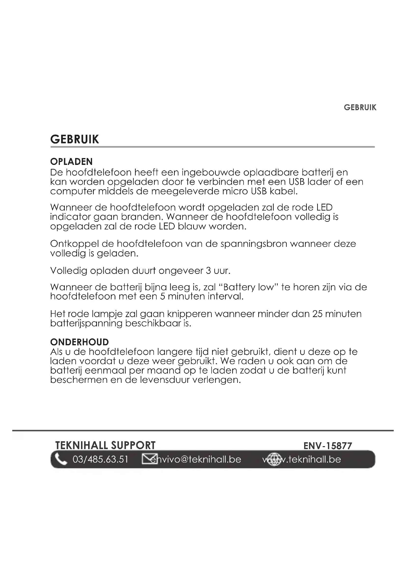 u kunt nu luisteren naar uw favoriete muziek en inkomende telefoongesprekken beantwoorden. BLUETOOTHENV-1587 9 03/485.63.51 envivo@teknihall.be www.teknihall.be TEKNIHALL SUPPORT BLUETOOTH Opmerking: Indien de hoofdtelefoon eerder verbonden is geweest met een telefoon/tablet zal de hoofdtelefoon automatisch verbinden met de telefoon/tablet , maar alleen als Bluetooth is ingeschakeld op de telefoon/tablet en deze binnen bereik is. Opmerking: Indien de hoofdtelefoon is verbonden met een andere telefoon/tablet zal deze niet zichtbaar zijn in de lijst met beschikbare apparaten en dient u eerst de Bluetooth verbinding op de nu verbonden telefoon/tablet te verbreken en opnieuw naar de hoofdtelefoon te zoeken. HANDENVRIJ BELLEN Wanneer u uw telefoon heft verbonden met de hoofdtelefoon bent u in staat om telefoongesprekken te voeren via de hoofdtelefoon. Muziek zal automatisch worden gepauzeerd indien er een gesprek binnenkomt. Druk op de knop om het telefoongesprek te beantwoorden en druk nogmaals op de knop om het gesprek te beëindigen, waarna het muziek afspelen automatisch zal worden hervat. Om inkomende gesprekken te weigeren, druk gedurende 1 seconde op de knop. Druk tweemaal op de knop om het laatst gebelde nummer opnieuw te bellen. Het volume verhogen: druk kort op de + knop. Het volume verlagen: druk kort op de – knop.ENV-158710 03/485.63.51 envivo@teknihall.be www.teknihall.be TEKNIHALL SUPPORT