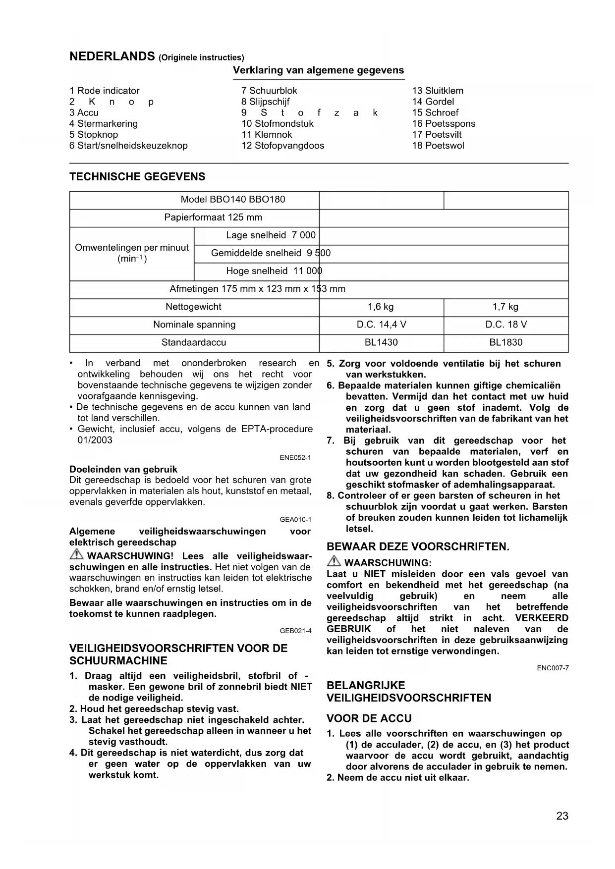 - Gewicht, inclusief accu, volgens de EPTA-procedure 01/2003 ENE052-1 Doeleinden van gebruik Dit gereedschap is bedoeld voor het schuren van grote oppervlakken in materialen als hout, kunststof en metaal, evenals geverfde oppervlakken. GEA010-1 Algemene veiligheidswaarschuwingen voor elektrisch gereedschap WAARSCHUWING! Lees alle veiligheidswaar- schuwingen en alle instructies. Het niet volgen van de waarschuwingen en instructies kan leiden tot elektrische schokken, brand en/of ernstig letsel. Bewaar alle waarschuwingen en instructies om in de toekomst te kunnen raadplegen. GEB021-4