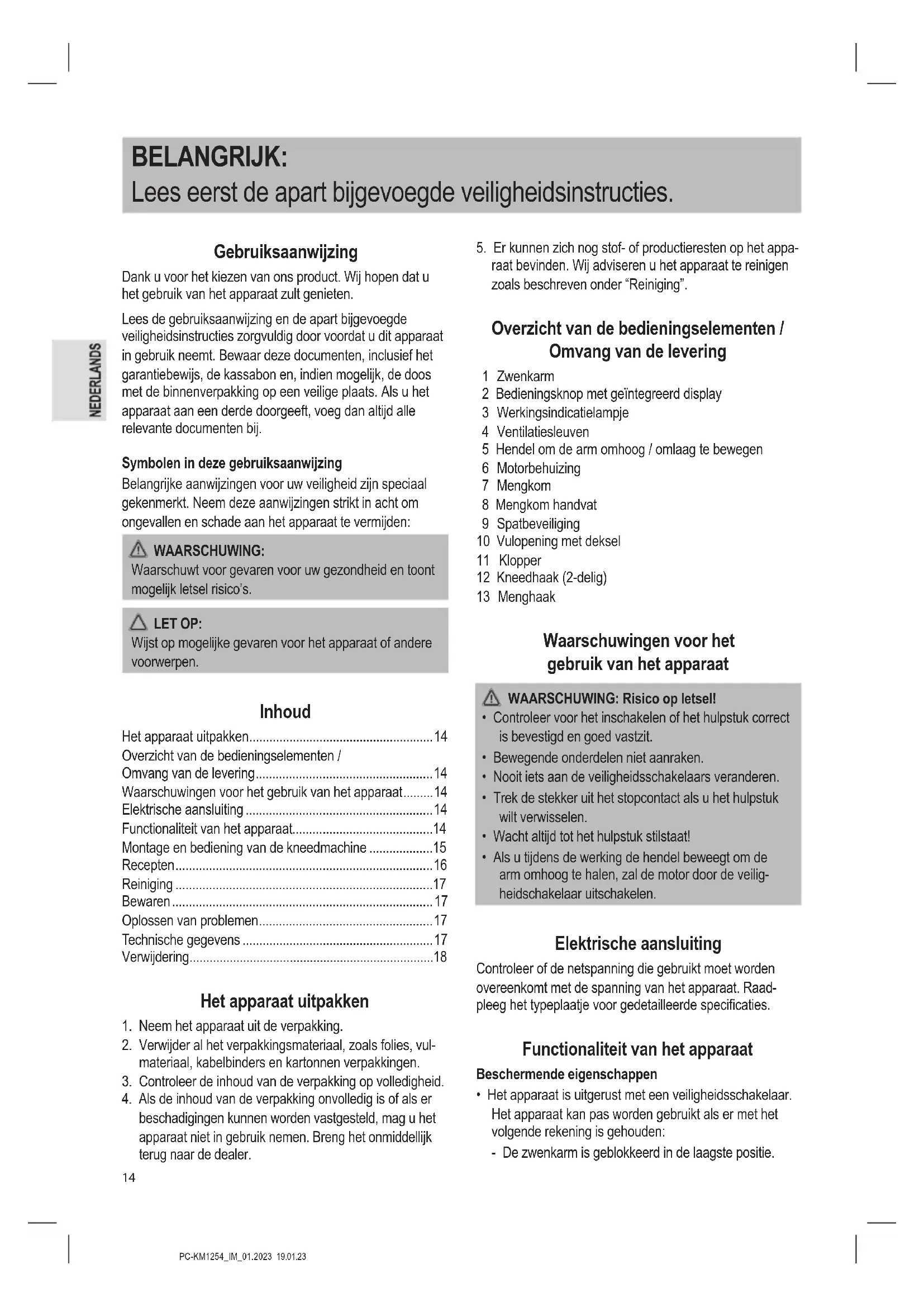 raat bevinden. Wij adviseren u het apparaat te reinigen zoals beschreven onder “Reiniging”. Overzicht van de bedieningselementen / Omvang van de levering 1 Zwenkarm 2 Bedieningsknop met geïntegreerd display 3 Werkingsindicatielampje 4 Ventilatiesleuven 5 Hendel om de arm omhoog / omlaag te bewegen 6 Motorbehuizing 7 Mengkom 8 Mengkom handvat 9 Spatbeveiliging 10 Vulopening met deksel 11 Klopper 12 Kneedhaak (2-delig) 13 Menghaak Waarschuwingen voor het gebruik van het apparaat WAARSCHUWING: Risico op letsel!