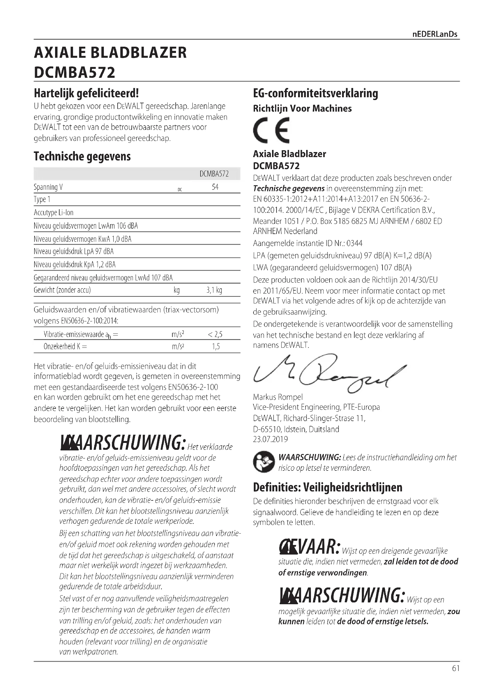 WAARSCHUWING: Wijst op een mogelijk gevaarlijke situatie die, indien niet vermeden, zou kunnen leiden tot de dood of ernstigeletsels. EG-conformiteitsverklaring Richtlijn Voor Machines Axiale Bladblazer DCMBA572 DeWALT verklaart dat deze producten zoals beschreven onder Technische gegevens in overeenstemming zijn met: EN 60335-1:2012+A11:2014+A13:2017 en EN 50636-2-100:2014. 2000/14/EC , Bijlage V DEKRA Certification B.V., Meander 1051 / P.O. Box 5185 6825 MJ ARNHEM / 6802 ED ARNHEM Nederland Aangemelde instantie ID Nr.: 0344 LPA (gemeten geluidsdrukniveau) 97 dB(A) K=1,2 dB(A)LWA (gegarandeerd geluidsvermogen) 107 dB(A)Deze producten voldoen ook aan de Richtlijn 2014/30/EU en 2011/65/EU. Neem voor meer informatie contact op met DeWALT via het volgende adres of kijk op de achterzijde van degebruiksaanwijzing.De ondergetekende is verantwoordelijk voor de samenstelling van het technische bestand en legt deze verklaring af namensDeWALT.Markus Rompel Vice-President Engineering, PTE-Europa DeWALT, Richard-Slinger-Strase 11, D-65510, Idstein, Duitsland 23.07.2019Het vibratie- en/of geluids-emissieniveau dat in dit informatieblad wordt gegeven, is gemeten in overeenstemming met een gestandaardiseerde test volgens EN50636-2-100 en kan worden gebruikt om het ene gereedschap met het andere te vergelijken. Het kan worden gebruikt voor een eerste beoordeling vanblootstelling.