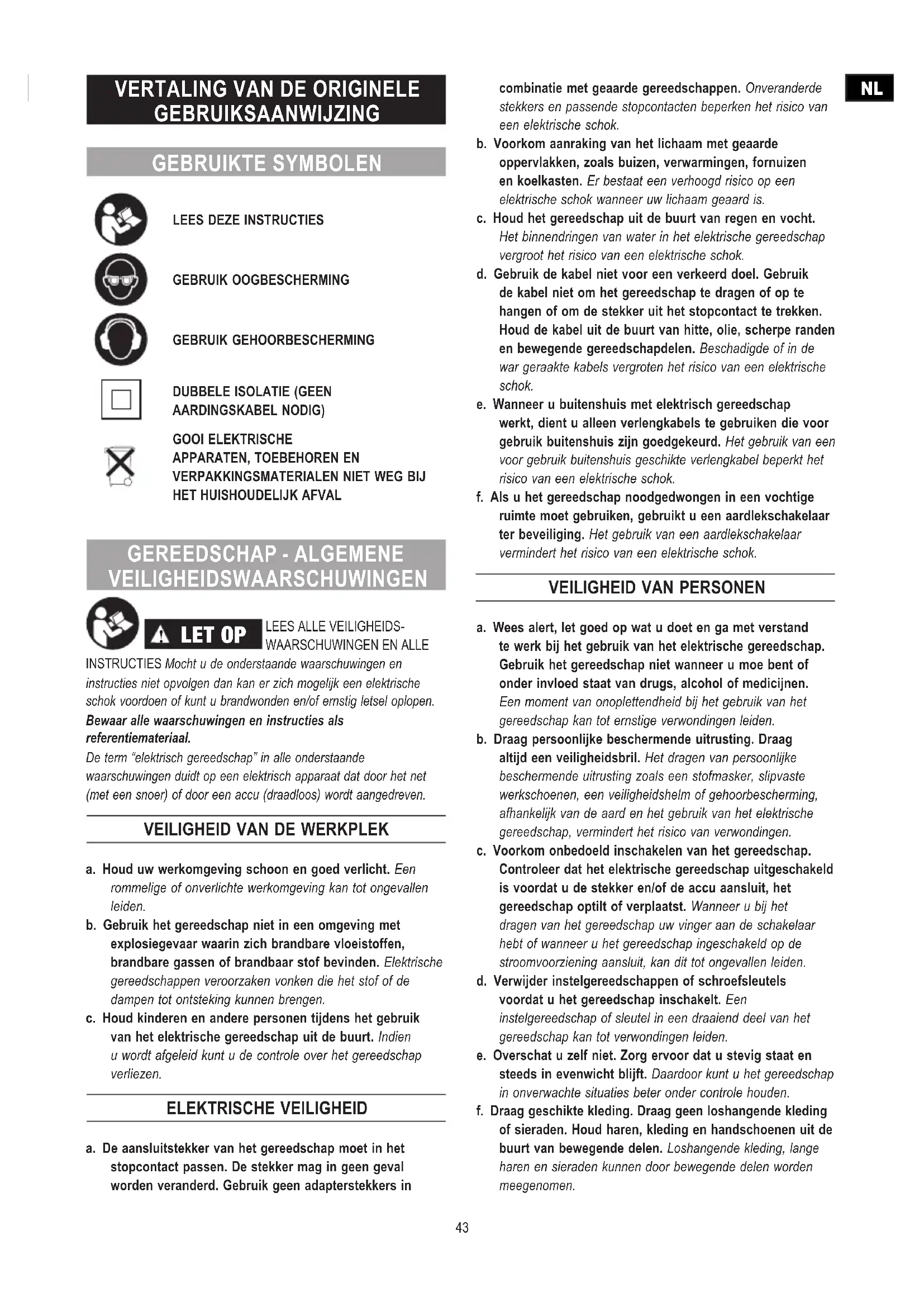 a. Laad het apparaat alleen op met de door de fabrikant genoemde lader. Een lader die geschikt is voor een bepaald type accu, kan bij gebruik met een andere accu brand veroorzaken. b. Gebruik elektrisch gereedschap alleen met de speciaal daarvoor bestemde accu’s. Het gebruik van een andere accu geeft kans op letsel en brand. c. Als de accu niet in gebruik is, houd deze dan uit de buurt van metalen voorwerpen (paperclips, munten, sleutels, spijkers, schroeven en andere kleine metalen voorwerpen) die kortsluiting van de polen kunnen veroorzaken. Het kortsluiten van de polen kan brandwonden of brand tot gevolg hebben. d. Bij ruw gebruik van het gereedschap kan vloeistof uit de accu komen. Vermijd contact daarmee. Als u toch per ongeluk in contact komt met deze vloeistof, spoel dan af met voldoende water. Als de vloeistof in contact komt met de ogen, dient u medische hulp in te roepen. Vloeistof uit de accu kan irritatie of brandwonden veroorzaken. SERVICE a. Laat het gereedschap alleen repareren door gekwalificeerd en vakkundig personeel en alleen met originele vervangingsonderdelen. Daarmee wordt gewaarborgd dat de veiligheid van het gereedschap in stand blijft. GEREEDSCHAPSPECIFIEKE VEILIGHEIDSVOORSCHRIFTEN VEILIGHEIDSWAARSCHUWINGEN DOORSLIJPMACHINE a. Voor optimale veiligheid moet de bijgeleverde beschermkap stevig op het gereedschap worden bevestigd en geplaatst zodat er zo min mogelijk risico is op contact tussen slijpschijf en gebruiker. Zorg dat uzelf en omstanders afstand houden van het schaafvlak van de ronddraaiende slijpschijf. De beschermkap beschermt de gebruiker tegen afgebroken deeltjes van de slijpschijf en onvoorzien contact met de schijf. b. Gebruik alleen vezelversterkte schijven of diamantschijven voor uw gereedschap. Het feit dat u het toebehoren aan het elektrische gereedschap kunt bevestigen, waarborgt nog geen veilig gebruik. c. Het toegestane toerental van het inzetgereedschap moet minstens zo hoog zijn als het maximale toerental dat op het elektrische gereedschap is aangegeven. Toebehoren dat sneller draait dan is toegestaan, kan onherstelbaar worden beschadigd. d. Slijptoebehoren mag alleen worden gebruikt voor de geadviseerde toepassingsmogelijkheden. Bijvoorbeeld: slijp nooit met het zijvlak van een doorslijpschijf. Doorslijpschijven zijn bestemd voor materiaalafname met de rand van de schijf. Een zijwaartse krachtinwerking op dit slijptoebehoren kan het toebehoren breken. e. Gebruik altijd onbeschadigde spanflenzen in de juiste maat en vorm voor de door u gekozen slijpschijf. Geschikte flenzen steunen de slijpschijf en verminderen zo het gevaar van een slijpschijfbreuk. f. Gebruik geen versleten slijpschijven van grotere elektrische gereedschappen. Slijpschijven voor grotere elektrische gereedschappen zijn niet geconstrueerd voor de hogere toerentallen van kleinere elektrische gereedschappen en kunnen breken. g. De buitendiameter en de dikte van het inzetgereedschap moeten overeenkomen met de maatgegevens van het 44elektrische gereedschap. Inzetgereedschappen met onjuiste afmetingen kunnen niet voldoende afgeschermd of gecontroleerd worden. h. Slijpschijven en flenzen moeten nauwkeurig op de uitgaande as van het elektrische gereedschap passen. Inzetgereedschappen die niet nauwkeurig op de uitgaande as van het elektrische gereedschap passen, draaien ongelijkmatig, trillen sterk en kunnen tot het verlies van de controle leiden.