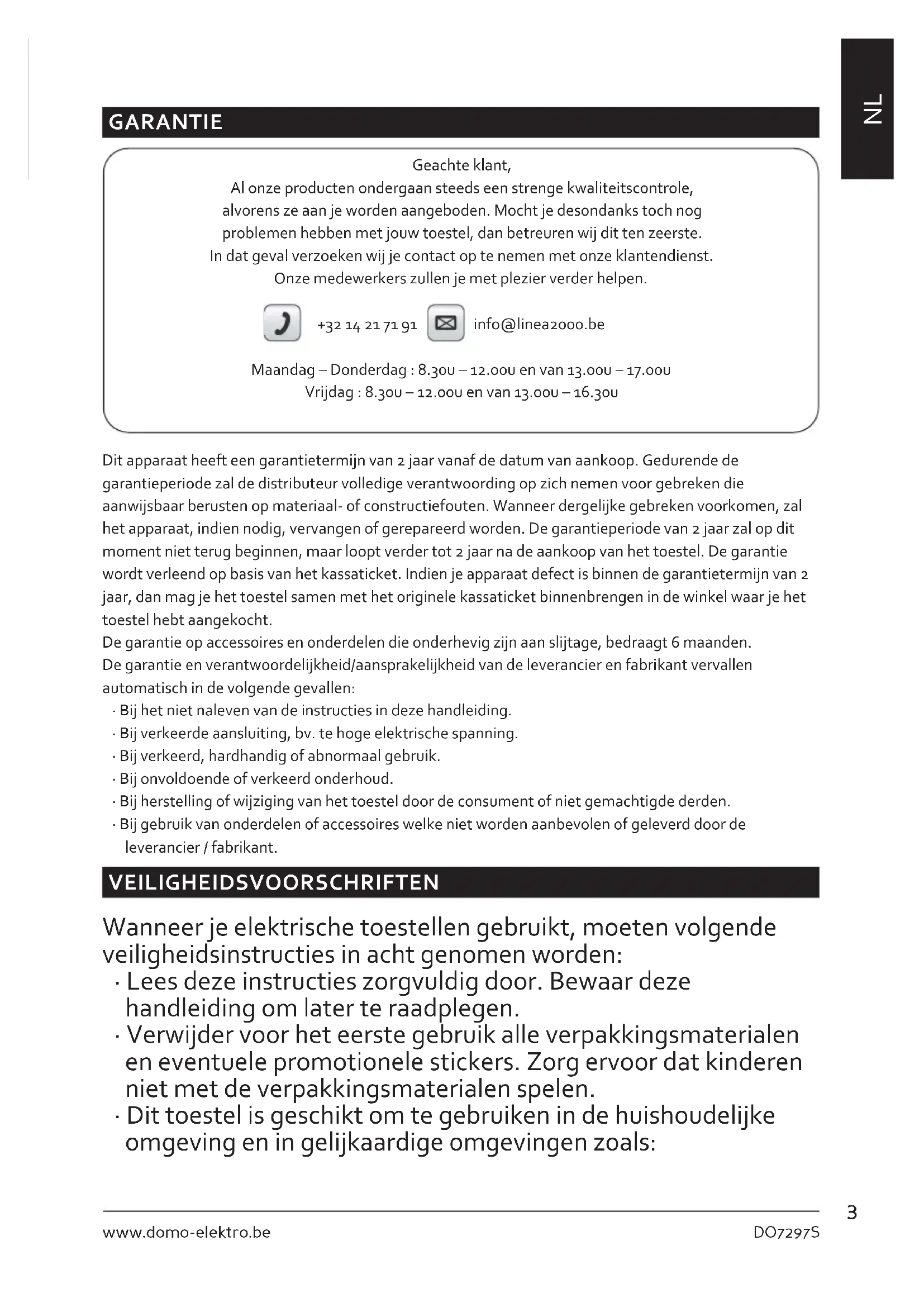 GARANTIE Geachte klant, Al onze producten ondergaan steeds een strenge kwaliteitscontrole, alvorens ze aan je worden aangeboden. Mocht je desondanks toch nog problemen hebben met jouw toestel, dan betreuren wij dit ten zeerste. In dat geval verzoeken wij je contact op te nemen met onze klantendienst. Onze medewerkers zullen je met plezier verder helpen. +32 14 21 71 91 info@linea2000.be Maandag – Donderdag : 8.30u – 12.00u en van 13.00u – 17.00u Vrijdag : 8.30u – 12.00u en van 13.00u – 16.30u Dit apparaat heeft een garantietermijn van 2 jaar vanaf de datum van aankoop. Gedurende de garantieperiode zal de distributeur volledige verantwoording op zich nemen voor gebreken die aanwijsbaar berusten op materiaal- of constructiefouten. Wanneer dergelijke gebreken voorkomen, zal het apparaat, indien nodig, vervangen of gerepareerd worden. De garantieperiode van 2 jaar zal op dit moment niet terug beginnen, maar loopt verder tot 2 jaar na de aankoop van het toestel. De garantie wordt verleend op basis van het kassaticket. Indien je apparaat defect is binnen de garantietermijn van 2 jaar, dan mag je het toestel samen met het originele kassaticket binnenbrengen in de winkel waar je het toestel hebt aangekocht. De garantie op accessoires en onderdelen die onderhevig zijn aan slijtage, bedraagt 6 maanden. De garantie en verantwoordelijkheid/aansprakelijkheid van de leverancier en fabrikant vervallen automatisch in de volgende gevallen: