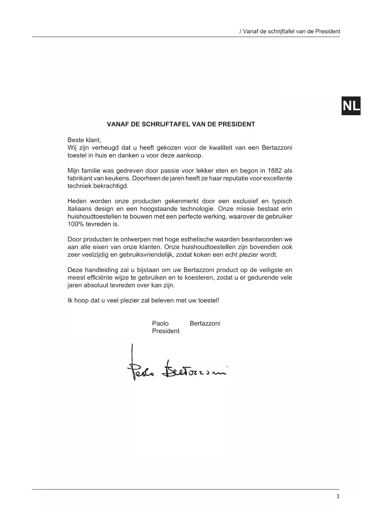Beste klant, Wij zijn verheugd dat u heeft gekozen voor de kwaliteit van een Bertazzoni toestel in huis en danken u voor deze aankoop. Mijn familie was gedreven door passie voor lekker eten en begon in 1882 als fabrikant van keukens. Doorheen de jaren heeft ze haar reputatie voor excellente techniek bekrachtigd. Heden worden onze producten gekenmerkt door een exclusief en typisch Italiaans design en een hoogstaande technologie. Onze missie bestaat erin huishoudtoestellen te bouwen met een perfecte werking, waarover de gebruiker 100% tevreden is. Door producten te ontwerpen met hoge esthetische waarden beantwoorden we aan alle eisen van onze klanten. Onze huishoudtoestellen zijn bovendien ook zeer veelzijdig en gebruiksvriendelijk, zodat koken een echt plezier wordt. Deze handleiding zal u bijstaan om uw Bertazzoni product op de veiligste en meest effi ciënte wijze te gebruiken en te koesteren, zodat u er gedurende vele jaren absoluut tevreden over kan zijn. Ik hoop dat u veel plezier zal beleven met uw toestel! Paolo Bertazzoni President4
