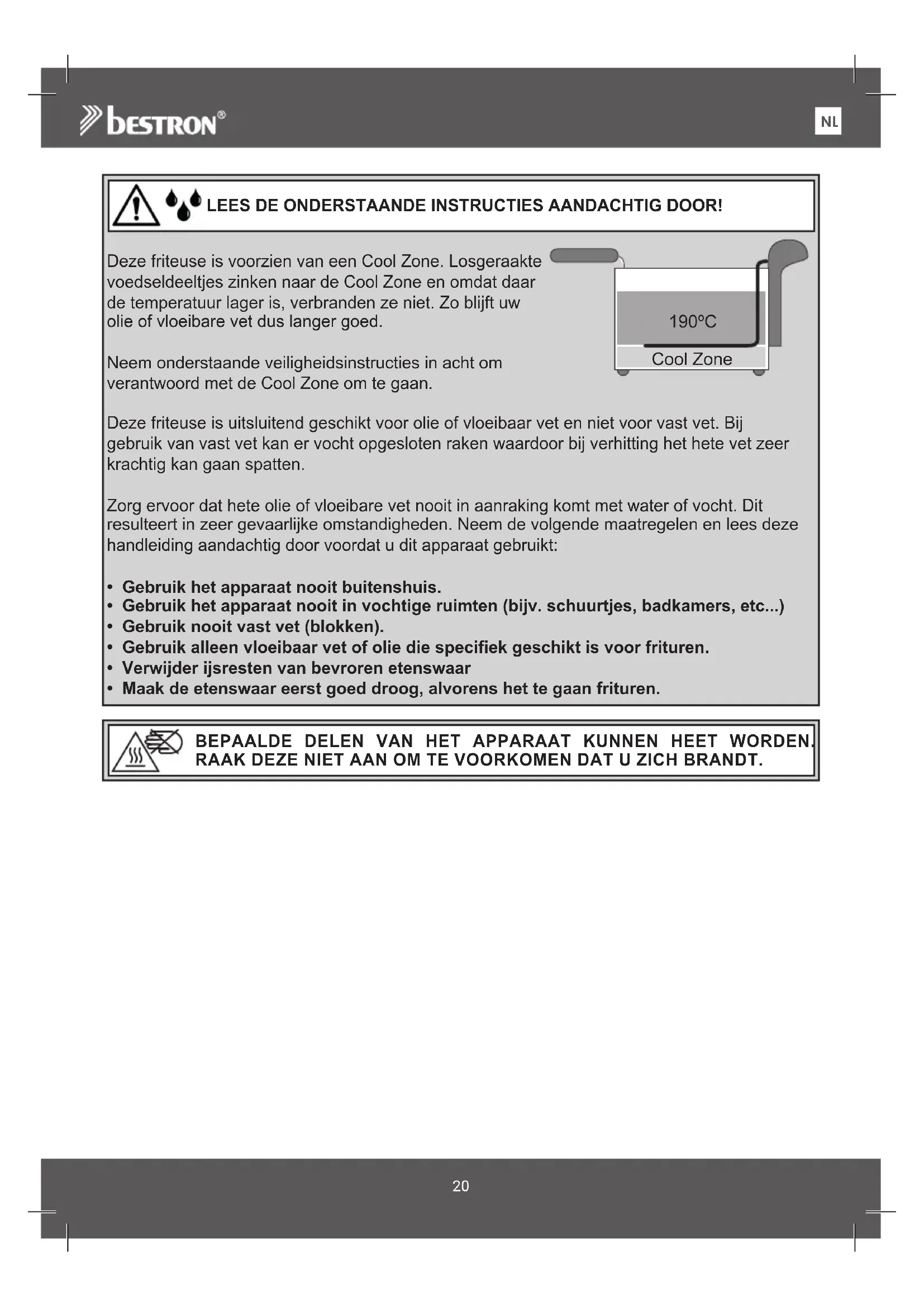Deze friteuse is voorzien van een Cool Zone. Losgeraakte voedseldeeltjes zinken naar de Cool Zone en omdat daar de temperatuur lager is, verbranden ze niet. Zo blijft uw olie of vloeibare vet dus langer goed. Neem onderstaande veiligheidsinstructies in acht om verantwoord met de Cool Zone om te gaan. Deze friteuse is uitsluitend geschikt voor olie of vloeibaar vet en niet voor vast vet. Bij gebruik van vast vet kan er vocht opgesloten raken waardoor bij verhitting het hete vet zeer krachtig kan gaan spatten. Zorg ervoor dat hete olie of vloeibare vet nooit in aanraking komt met water of vocht. Dit resulteert in zeer gevaarlijke omstandigheden. Neem de volgende maatregelen en lees deze handleiding aandachtig door voordat u dit apparaat gebruikt: