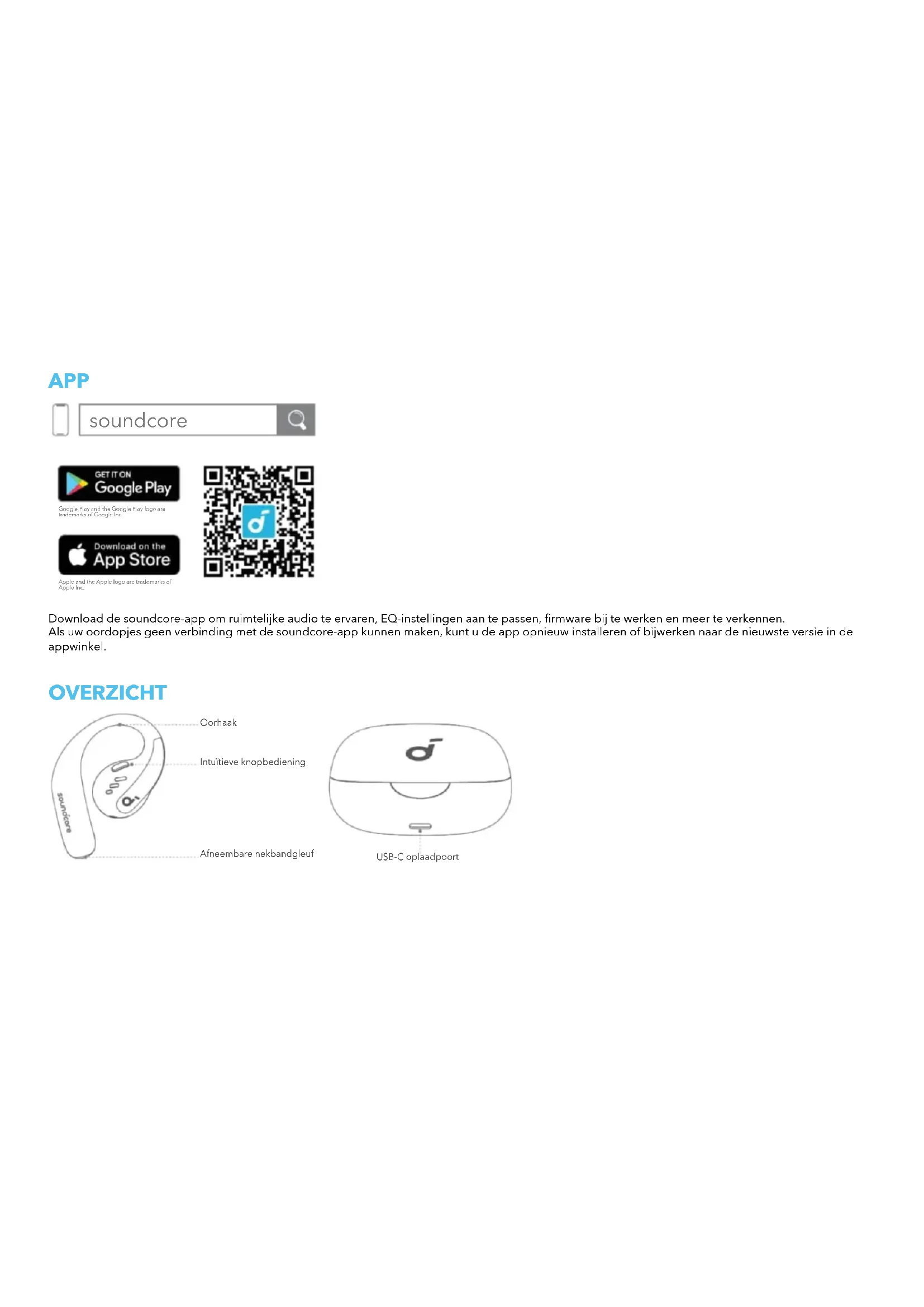 KNOPPEN LDAC FIRMWARE-UPDATE RESETTEN SPECIFICATIESAPP soundcore Apple and the Apple logo are trademarks of Apple Inc. Google Play and the Google Play logo are trademarks of Google Inc. Download de soundcore-app om ruimtelijke audio te ervaren, EQ-instellingen aan te passen, firmware bij te werken en meer te verkennen. Als uw oordopjes geen verbinding met de soundcore-app kunnen maken, kunt u de app opnieuw installeren of bijwerken naar de nieuwste versie in de appwinkel. OVERZICHT Intuïtieve knopbediening Oorhaak Afneembare nekbandgleuf USB-C oplaadpoort APP soundcore Apple and the Apple logo are trademarks of Apple Inc. Google Play and the Google Play logo are trademarks of Google Inc. Download de soundcore-app om ruimtelijke audio te ervaren, EQ-instellingen aan te passen, firmware bij te werken en meer te verkennen. Als uw oordopjes geen verbinding met de soundcore-app kunnen maken, kunt u de app opnieuw installeren of bijwerken naar de nieuwste versie in de appwinkel. OVERZICHT Intuïtieve knopbediening Oorhaak Afneembare nekbandgleuf USB-C oplaadpoortDRAGEN Zonder afneembaar koord (dagelijks gebruik):