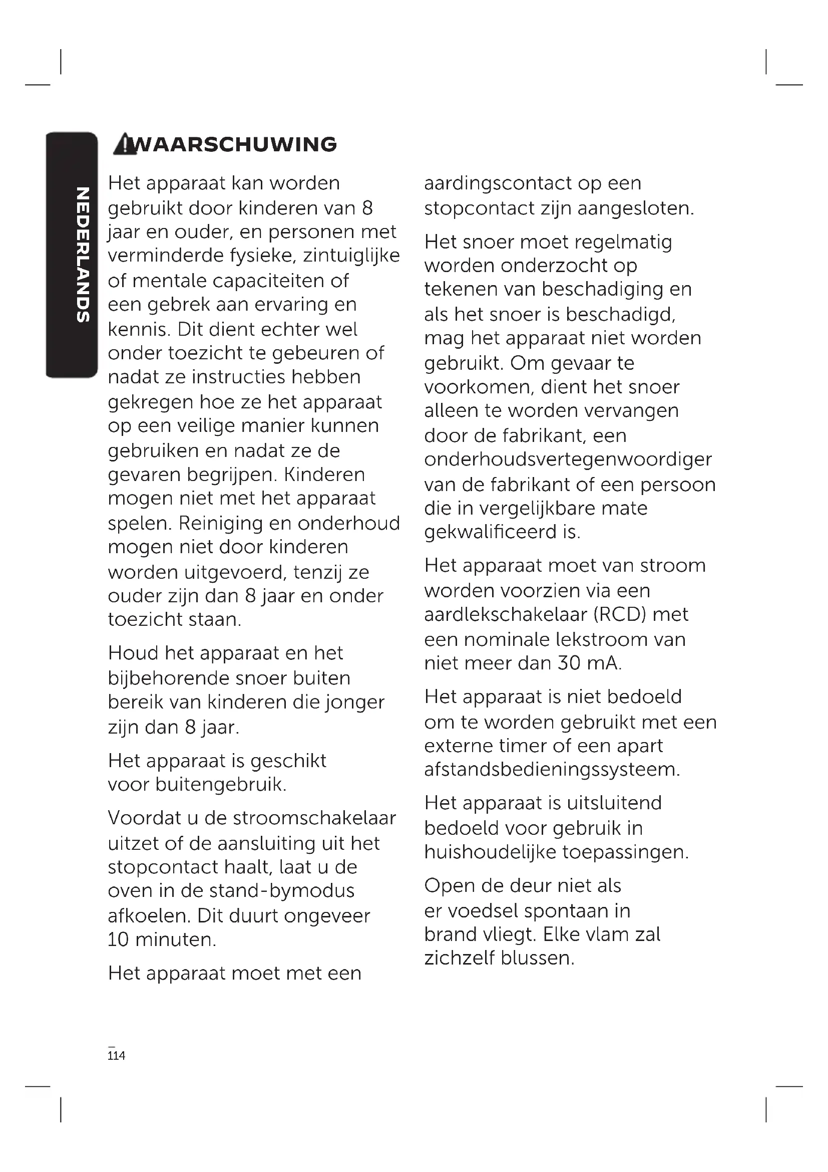 LATVIEŠU114 WAARSCHUWING Het apparaat kan worden gebruikt door kinderen van 8 jaar en ouder, en personen met verminderde fysieke, zintuiglijke of mentale capaciteiten of een gebrek aan ervaring en kennis. Dit dient echter wel onder toezicht te gebeuren of nadat ze instructies hebben gekregen hoe ze het apparaat op een veilige manier kunnen gebruiken en nadat ze de gevaren begrijpen. Kinderen mogen niet met het apparaat spelen. Reiniging en onderhoud mogen niet door kinderen worden uitgevoerd, tenzij ze ouder zijn dan 8 jaar en onder toezicht staan. Houd het apparaat en het bijbehorende snoer buiten bereik van kinderen die jonger zijn dan 8 jaar. Het apparaat is geschikt voor buitengebruik. Voordat u de stroomschakelaar uitzet of de aansluiting uit het stopcontact haalt, laat u de oven in de stand-bymodus afkoelen. Dit duurt ongeveer 10 minuten. Het apparaat moet met een aardingscontact op een stopcontact zijn aangesloten. Het snoer moet regelmatig worden onderzocht op tekenen van beschadiging en als het snoer is beschadigd, mag het apparaat niet worden gebruikt. Om gevaar te voorkomen, dient het snoer alleen te worden vervangen door de fabrikant, een onderhoudsvertegenwoordiger van de fabrikant of een persoon die in vergelijkbare mate gekwalificeerd is. Het apparaat moet van stroom worden voorzien via een aardlekschakelaar (RCD) met een nominale lekstroom van niet meer dan 30 mA. Het apparaat is niet bedoeld om te worden gebruikt met een externe timer of een apart afstandsbedieningssysteem. Het apparaat is uitsluitend bedoeld voor gebruik in huishoudelijke toepassingen. Open de deur niet als er voedsel spontaan in brand vliegt. Elke vlam zal zichzelf blussen. NEDERLANDS115