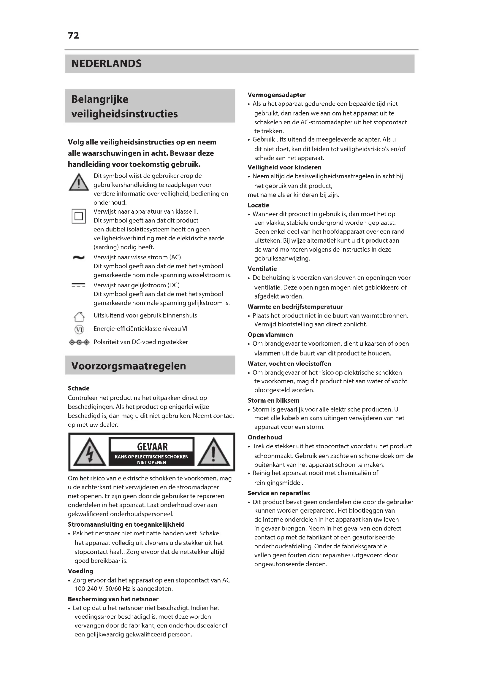 Dit symbool wijst de gebruiker erop de gebruikershandleiding te raadplegen voor verdere informatie over veiligheid, bediening en onderhoud.Verwijst naar apparatuur van klasse II.Dit symbool geeft aan dat dit product een dubbel isolatiesysteem heeft en geen veiligheidsverbinding met de elektrische aarde (aarding) nodig heeft.Verwijst naar wisselstroom (AC)Dit symbool geeft aan dat de met het symbool gemarkeerde nominale spanning wisselstroom is.Verwijst naar gelijkstroom (DC) Dit symbool geeft aan dat de met het symbool gemarkeerde nominale spanning gelijkstroom is.Uitsluitend voor gebruik binnenshuisEnergie-eciëntieklasse niveau VIPolariteit van DC-voedingsstekker Voorzorgsmaatregelen SchadeControleer het product na het uitpakken direct op beschadigingen. Als het product op enigerlei wijze beschadigd is, dan mag u dit niet gebruiken. Neemt contact op met uw dealer. GEVAAR KANS OP ELECTRISCHE SCHOKKENNIET OPENENOm het risico van elektrische schokken te voorkomen, mag u de achterkant niet verwijderen en de stroomadapter niet openen. Er zijn geen door de gebruiker te repareren onderdelen in het apparaat. Laat onderhoud over aan gekwaliceerd onderhoudspersoneel.Stroomaansluiting en toegankelijkheid• Pak het netsnoer niet met natte handen vast. Schakel het apparaat volledig uit alvorens u de stekker uit het stopcontact haalt. Zorg ervoor dat de netstekker altijd goed bereikbaar is.Voeding• Zorg ervoor dat het apparaat op een stopcontact van AC 100-240 V, 50/60 Hz is aangesloten.Bescherming van het netsnoer• Let op dat u het netsnoer niet beschadigt. Indien het voedingssnoer beschadigd is, moet deze worden vervangen door de fabrikant, een onderhoudsdealer of een gelijkwaardig gekwaliceerd persoon.Vermogensadapter• Als u het apparaat gedurende een bepaalde tijd niet gebruikt, dan raden we aan om het apparaat uit te schakelen en de AC-stroomadapter uit het stopcontact te trekken.• Gebruik uitsluitend de meegeleverde adapter. Als u dit niet doet, kan dit leiden tot veiligheidsrisico's en/of schade aan het apparaat.Veiligheid voor kinderen• Neem altijd de basisveiligheidsmaatregelen in acht bij het gebruik van dit product,met name als er kinderen bij zijn.Locatie• Wanneer dit product in gebruik is, dan moet het op een vlakke, stabiele ondergrond worden geplaatst. Geen enkel deel van het hoofdapparaat over een rand uitsteken. Bij wijze alternatief kunt u dit product aan de wand monteren volgens de instructies in deze gebruiksaanwijzing.Ventilatie• De behuizing is voorzien van sleuven en openingen voor ventilatie. Deze openingen mogen niet geblokkeerd of afgedekt worden.Warmte en bedrijfstemperatuur• Plaats het product niet in de buurt van warmtebronnen. Vermijd blootstelling aan direct zonlicht.Open vlammen• Om brandgevaar te voorkomen, dient u kaarsen of open vlammen uit de buurt van dit product te houden.Water, vocht en vloeistoen• Om brandgevaar of het risico op elektrische schokken te voorkomen, mag dit product niet aan water of vocht blootgesteld worden.Storm en bliksem• Storm is gevaarlijk voor alle elektrische producten. U moet alle kabels en aansluitingen verwijderen van het apparaat voor een storm.Onderhoud• Trek de stekker uit het stopcontact voordat u het product schoonmaakt. Gebruik een zachte en schone doek om de buitenkant van het apparaat schoon te maken.• Reinig het apparaat nooit met chemicaliën of reinigingsmiddel.Service en reparaties• Dit product bevat geen onderdelen die door de gebruiker kunnen worden gerepareerd. Het blootleggen van de interne onderdelen in het apparaat kan uw leven in gevaar brengen. Neem in het geval van een defect contact op met de fabrikant of een geautoriseerde onderhoudsafdeling. Onder de fabrieksgarantie vallen geen fouten door reparaties uitgevoerd door ongeautoriseerde derden.NL Verwijdering van dit apparaat Informatie voor gebruikers over de inzameling en verwijdering van oude apparatuur. Dit symbool betekent dat dit product onder de Europese Richtlijn 2012/19/EU valt en niet weggegooid of gedumpt mag worden met ander huishoudelijk afval. Dit symbool betekent dat het product zodanig ontworpen en vervaardigd is dat dit gerecycled en hergebruikt kan worden. Deze symbolen op de producten, verpakkingen en/of begeleidende documenten betekenen dat u gebruikte elektrische en elektronische producten en batterijen niet met het gewone huishoudelijke afval mag weggooien. Voor bijzonderheden over waar en hoe zij deze artikelen kunnen inleveren voor een milieuveilige recycling kunnen huishoudelijke gebruikers contact opnemen met de detailhandelaar waar zij dit product hebben gekocht of met hun plaatselijke overheidskantoor. CE- en UKCA-verklaring:
