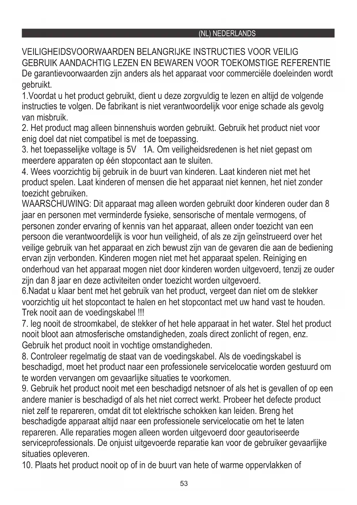 1.Voordat u het product gezruikt, dient u deze zorgvuldig te lezen en.altijd de volgende instructies te volgen. De fabrikant is nicht verantwoordelijk voor enige schade als gevolg van misbruik.