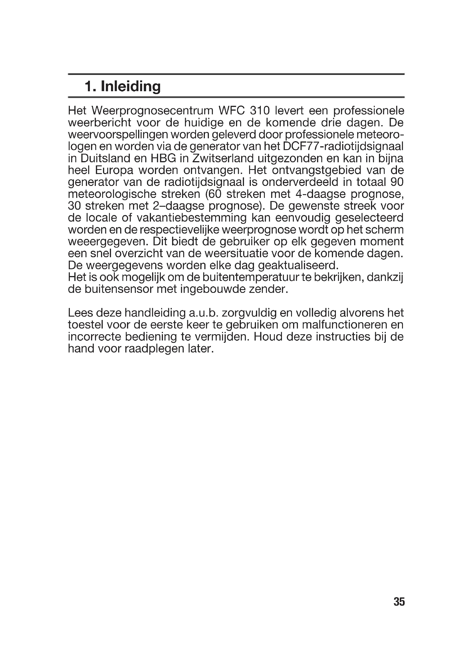 Het Weerprognosecentrum WFC 310 levert een professionele weerbericht voor de huidige en de komende drie dagen. De weervoorspellingen worden geleverd door professionele meteorologen en worden via de generator van het DCF77-radiotijdsignaal in Duitsland en HBG in Zwitserland uitgezonden en kan in bijna heel Europa worden ontvangen. Het ontvangstgebied van de generator van de radiotijdsignaal is onderverdeeld in totaal 90 meteorologische streken (60 streken met 4-daagse prognose, 30 streken met 2-daagse prognose). De gewenste streek voor de locale of vakantiebestemming kan eenvoudig geselecteerd worden en de respectievelijke weerprognose wordt op het scherm weeergegeven. Dit biedt de gebruiker op elk gegeven moment een snel overzicht van de weersituatie voor de komende dagen. De weergegevens worden elke dag geaktualiseerd.
