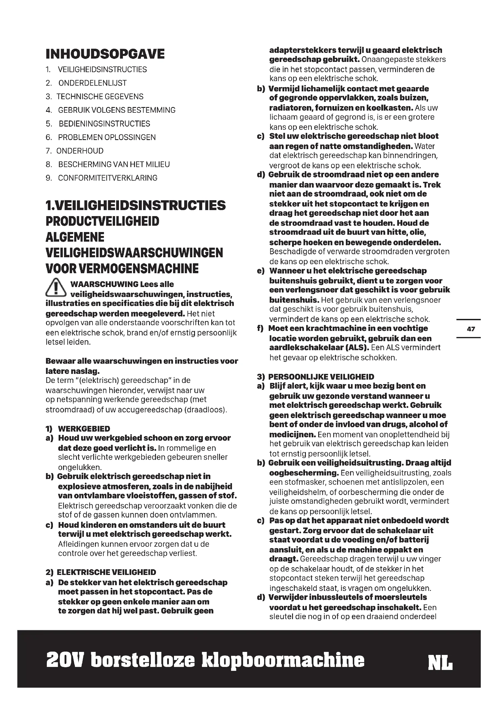 VEILIGHEIDSINSTRUCTIES PRODUCTVEILIGHEID ALGEMENE VEILIGHEIDSWAARSCHUWINGEN VOOR VERMOGENSMACHINE WAARSCHUWING Lees alle veiligheidswaarschuwingen, instructies, illustraties en specificaties die bij dit elektrisch gereedschap werden meegeleverd. Het niet opvolgen van alle onderstaande voorschriften kan tot een elektrische schok, brand en/of ernstig persoonlijk letsel leiden. Bewaar alle waarschuwingen en instructies voor latere naslag. De term “(elektrisch) gereedschap” in de waarschuwingen hieronder, verwijst naar uw op netspanning werkende gereedschap (met stroomdraad) of uw accugereedschap (draadloos).