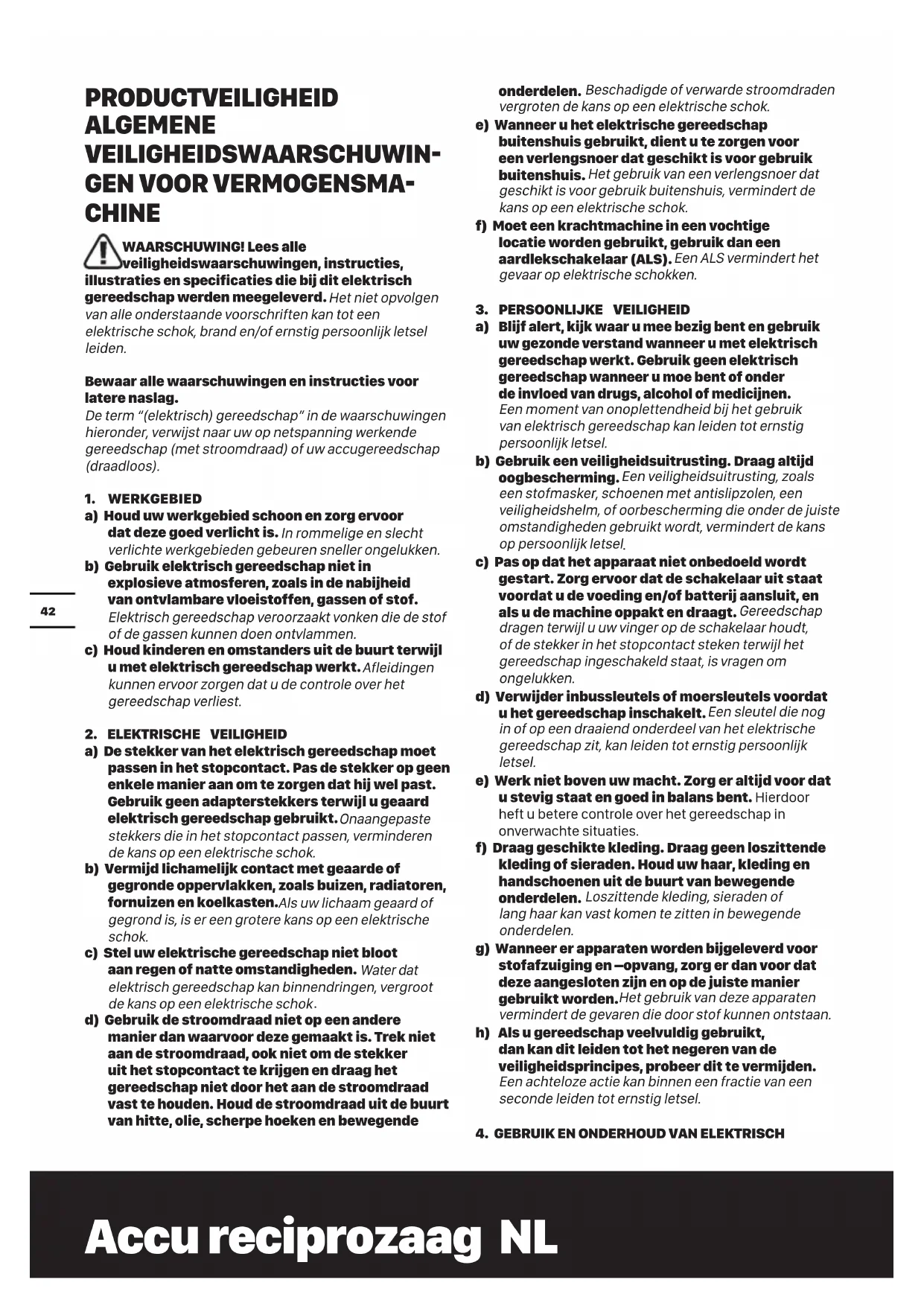 Laat uw elektrisch gereedschap repareren door een bevoegde reparateur die alleen originele reserveonderdelen gebruikt . Zo bent u er zeker van dat uw gereedschap veilig blijft. b) Repareer nooit beschadigde accu’s. Reparatie van accu’s mag alleen worden uitgevoerd door de fabrikant of geautoriseerde onderhoudstechnici. VEILIGHEIDS WAARSCHUWINGEN RECIPROZAAG