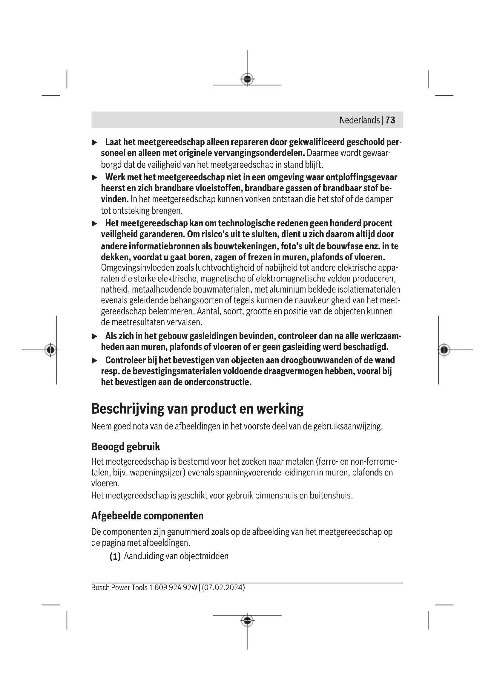 1 609 92A 92W | (07.02.2024) Bosch Power ToolsNederlands | 75 Digitale detector GMS 100-23 Energievoorziening – Batterijen (alkaline) 2×1,5V LR6(AA) – Oplaadbare batterijen (NiMH) 2×1,2V HR6(AA) – Li-Ion-accupack (accessoire) 3,7V Gebruiksduur ca. – met batterijen (alkaline) 9h – met oplaadbare batterijen (NiMH) 9h – met Li‑Ion-accupack (accessoire) 7h Gewicht – met batterijen (alkaline)/oplaadbare batterijen (NiMH) 0,28kg – met Li‑Ion-accupack (accessoire) 0,26kg Afmetingen (lengte× breedte× hoogte) 186 × 86 × 33mm Beschermklasse IP54 Li-Ion-accupack (accessoire) BA 3.7V 1.0Ah A Productnummer 1607A350N8 1607A3517H A) afhankelijk van het materiaal en de grootte van de objecten en van het materiaal en de toestand van de ondergrond B) bij koperen buis met een diameter van 15mm C) bij wapeningsstaal met een diameter van 12mm D) Geringere detectiediepte bij niet-spanningvoerende leidingen E) Er ontstaat slechts een niet geleidende vervuiling, waarbij echter soms een tijdelijke geleidbaar- heid wort verwacht door bedauwing. Het serienummer (14) op het typeplaatje dient voor een duidelijke identificatie van uw meetgereed- schap. u Het meetresultaat kan m.b.t. de nauwkeurigheid en de detectiediepte bij een on- gunstige hoedanigheid van de ondergrond slechter uitvallen. Energievoorziening meetgereedschap Het meetgereedschap kan ofwel met gangbare batterijen, met gangbare oplaadbare NiMH-batterijen of met een als accessoire verkrijgbareBosch Li‑Ion-accupack worden Bosch Power Tools 1 609 92A 92W | (07.02.2024)76 | Nederlands gebruikt. Voor het gebruik met een Li‑Ion-accupack neemt u goed nota van de gebruiks- aanwijzing van de Li‑Ion-accupack. Aanwijzing: Bewaar het meetgereedschap nooit zonder aangebracht batterijvakdeksel(12) of Li-Ion-accupack, vooral in een stoffige of vochtige omgeving is dit belangrijk. Batterijen plaatsen/verwisselen Voor het gebruik van het meetgereedschap wordt het gebruik van alkalinebatterijen of oplaadbare NiMH-batterijen geadviseerd. Voor het openen van het batterijvakdeksel(12) drukt u op de vergrendeling(13). Neem het batterijvakdeksel weg. Plaats de (oplaadbare) batterijen. Let er hierbij op dat de polen juist worden geplaatst volgens de afbeelding op de binnen- kant van het batterijvak. Breng het batterijvakdeksel(12) aan en laat het vastklikken. Verwissel altijd alle batterijen of accu’s tegelijkertijd. Gebruik alleen batterijen of accu’s van één fabrikant en met dezelfde capaciteit. u Haal de (oplaadbare) batterijen uit het meetgereedschap, wanneer u dit langere tijd niet gebruikt. De (oplaadbare) batterijen kunnen bij een langere periode van op- slag in het meetgereedschap corroderen en zichzelf ontladen. Gebruik u Bescherm het meetgereedschap tegen vocht en fel zonlicht. u Stel het meetgereedschap niet bloot aan extreme temperaturen of temperatuur- schommelingen. Laat het bij grotere temperatuurschommelingen eerst op de juiste temperatuur komen, voordat u het inschakelt. Bij extreme temperaturen of temperatuurschommelingen kan de nauwkeurigheid van het meetgereedschap nade- lig beïnvloed worden. u Vermijd heftige stoten of vallen van het meetgereedschap. Na sterke invloeden van buitenaf en bij opvallende zaken in de functionaliteit moet u het meetgereedschap bij een geautoriseerde Bosch-klantenservice laten controleren. u Houd het meetgereedschap alleen vast bij de hiervoor bestemde greepvlakken (8) om de meting niet te beïnvloeden. u Breng in het sensorgedeelte(11) op de achterkant van het meetgereedschap geen stickers of plaatjes aan. Vooral plaatjes van metaal beïnvloeden de meetresul- taten. 1 609 92A 92W | (07.02.2024) Bosch Power ToolsNederlands | 77 Draag tijdens de meting geen handschoenen en let op voldoende aarding. Bij onvoldoende aarding kan de herkenning van spanningvoerende leidingen worden belemmerd. Vermijd tijdens de meting de nabijheid van apparaten die sterke elektri- sche, magnetische of elektromagnetische velden uitzenden, zoals bijv. mobiele telefoons, laptops of tablets. Deactiveer indien mogelijk bij alle ap- paraten waarvan de straling de meting kan belemmeren, de betreffende func- ties of schakel de apparaten uit. Ingebruikname In-/uitschakelen u Zorg er vóór het inschakelen van het meetgereedschap voor dat het sensorgedeelte(11) niet vochtig is. Wrijf het meetgereedschap eventueel droog met een doek. u Als het meetgereedschap blootgesteld is geweest aan een sterke temperatuur- wisseling, laat u het vóór het inschakelen op de juiste temperatuur komen. Voor het inschakelen van het meetgereedschap drukt u op de aan/uit-toets(7). Voor het uitschakelen van het meetgereedschap drukt u opnieuw op de aan/uit- toets(7). Als ca. 5minuten lang geen toets op het meetgereedschap wordt ingedrukt en worden geen objecten gedetecteerd, dan schakelt het meetgereedschap automatisch uit. Geluidssignaal in- en uitschakelen Met de toets geluidssignaal(6) kunt u het geluidssignaal in- en uitschakelen. Werking (zieafbeeldingA) Met het meetgereedschap wordt de ondergrond van het sensorgedeelte(11) in mee- trichtingA tot aan de maximale detectiediepte onderzocht. Bij elke meting wordt automatisch gezocht naar metalen objecten (bijv. koperen buis of wapeningsstaal) en spanningvoerende leidingen (50−60Hz). Meetprocedure (zie afbeeldingB) Plaats het meetgereedschap op het te onderzoeken oppervlak. De lichtring(2) brandt om aan te geven dat het toestel gereed is om te meten. Houd het meetgereedschap gelijkmatig bij het greepvlak(8) vast. Verander uw grip tij- dens de meting niet en grijp vooral niet in het sensorgedeelte(11). Beweeg het meetgereedschap altijd in een rechte lijn in richting B met een lichte druk over de ondergrond, zonder het op te tillen of de aandrukkracht te veranderen. Het Bosch Power Tools 1 609 92A 92W | (07.02.2024)78 | Nederlands meetgereedschap moet voornamelijk in dwarsrichting ten opzichte van het gezochte ob- ject worden bewogen. Wanneer u de oriëntatie van het object in de muur niet ken