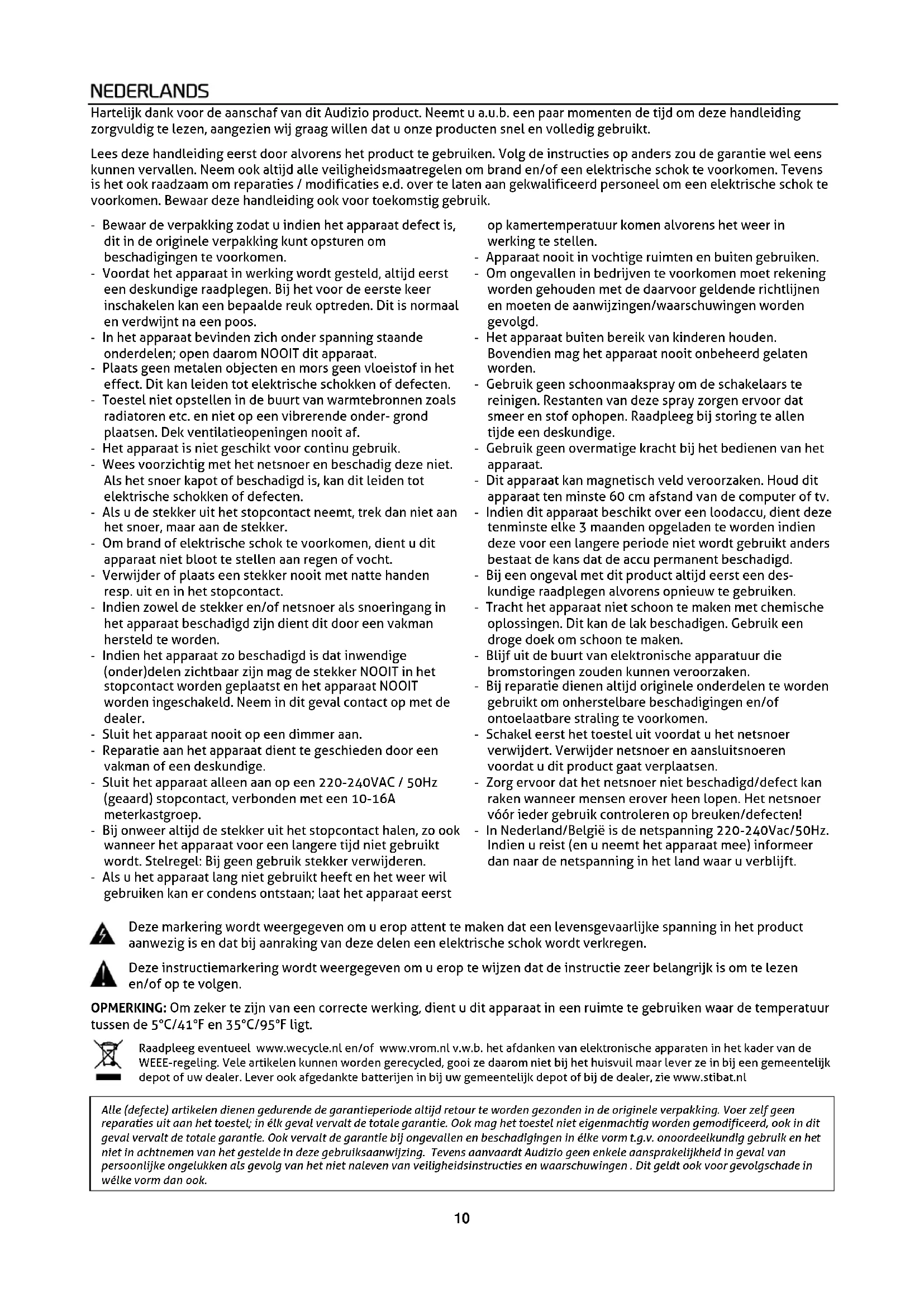 Alle (defecte) artikelen dienen gedurende de garantieperiode altijd retour te worden gezonden in de originele verpakking. Voer zelf geen reparaties uit aan het toestel; in élk geval vervalt de totale garantie. Ook mag het toestel niet eigenmachtig worden gemodificeerd, ook in dit geval vervalt de totale garantie. Ook vervalt de garantie bij ongevallen en beschadigingen in élke vorm t.g.v. onoordeelkundig gebruik en het niet in achtnemen van het gestelde in deze gebruiksaanwijzing. Tevens aanvaardt Audizio geen enkele aansprakelijkheid in geval van persoonlijke ongelukken als gevolg van het niet naleven van veiligheidsinstructies en waarschuwingen. Dit geldt ook voor gevolgschade in wélke vorm dan ook.