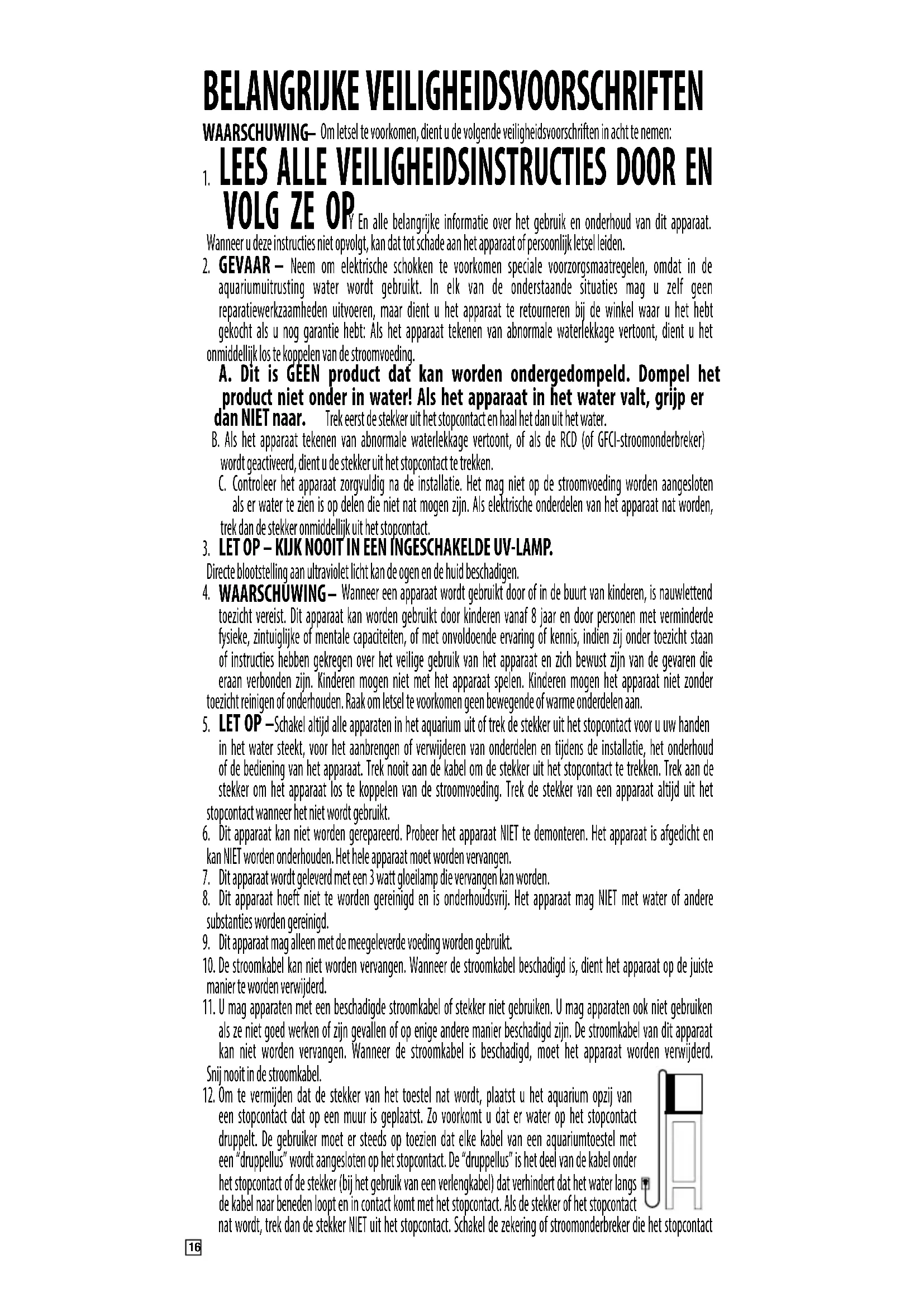 - Om te vermijden dat de stekker van het toestel nat worden,plaatst u het aquarium opzij van een stopcontact dat op een muur is geplaatst. Zo voorkomt u dat er water op het stopcontact druppelt. De gebruiker moet er steeds op toezien dat elke kabel van een aquariumtoestel met een "druppellus" wordt aangesloten op het stopcontact. De "druppellus" is het deel van de kabel onder het stopcontact of de stekker (bij het gebruik van een verlangkabel) dat verhinderst dat het water langs de kabel maar beneden loopt en in contact komt met het stopcontact. Als de stekker of het stopcontact
