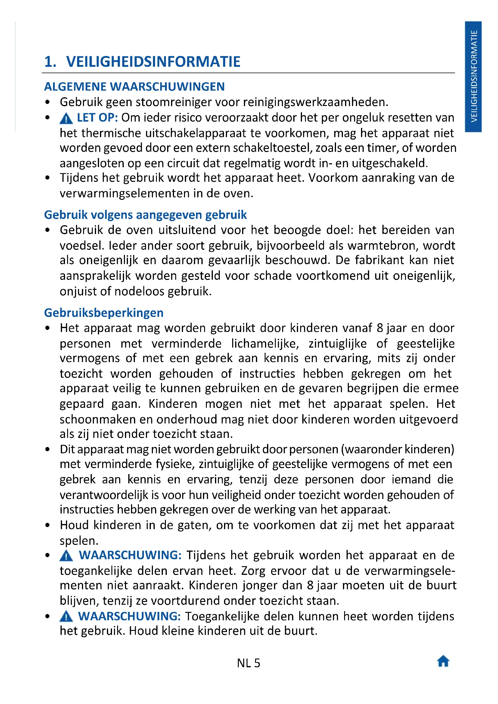 - Gebruik de oven uitsluitend voor het beoogde doel: het bereiden van voedsel. Ieder ander soort gebruik, bijvoorbeeld als warmtebron, wordt als oneigenlijk en daarom gevaarlijk beschouwd. De fabrikant kan niet aansprakelijk worden gesteld voor schade voortkomend uit oneigenlijk, onjuist of nodeloos gebruik. Gebruiksbeperkingen