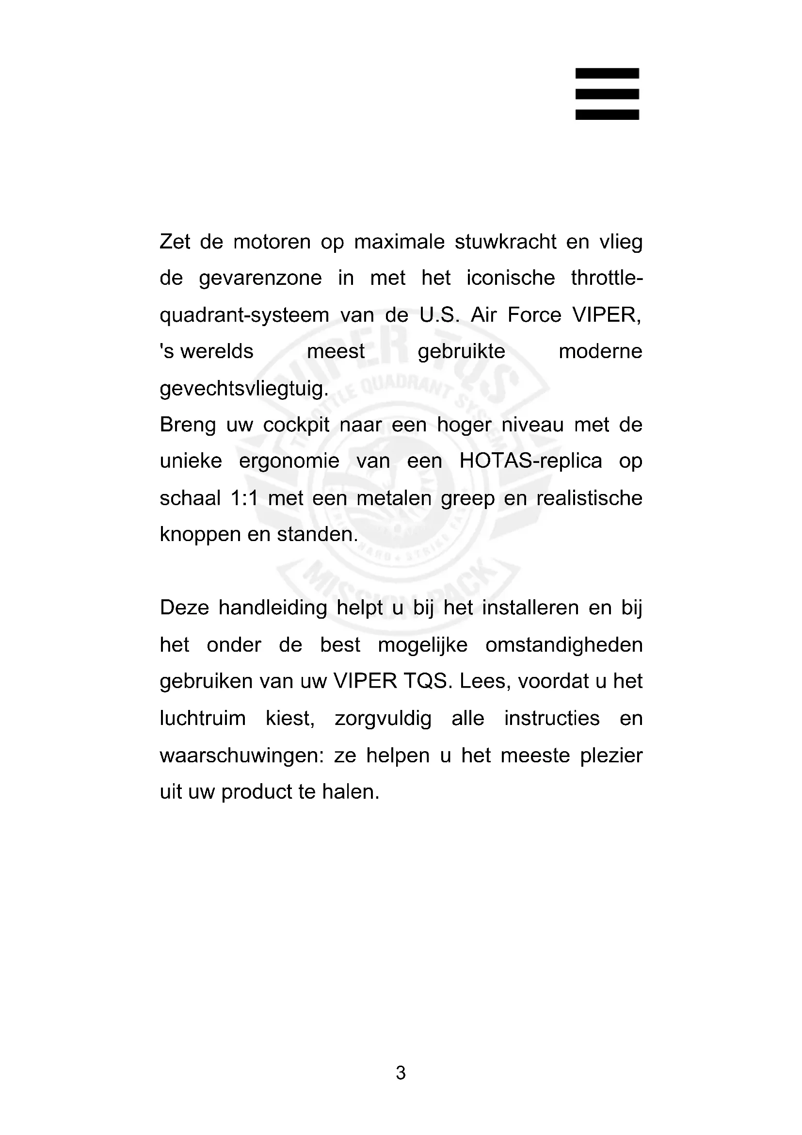 Zet de motoren op maximale stuwkracht en vlieg de gevarenzone in met het iconische throttle- quadrant-systeem van de U.S. Air Force VIPER, 's werelds meest gebruikte moderne gevechtsvliegtuig. Breng uw cockpit naar een hoger niveau met de unieke ergonomie van een HOTAS-replica op schaal 1:1 met een metalen greep en realistische knoppen en standen. Deze handleiding helpt u bij het installeren en bij het onder de best mogelijke omstandigheden gebruiken van uw VIPER TQS. Lees, voordat u het luchtruim kiest, zorgvuldig alle instructies en waarschuwingen: ze helpen u het meeste plezier uit uw product te halen.4