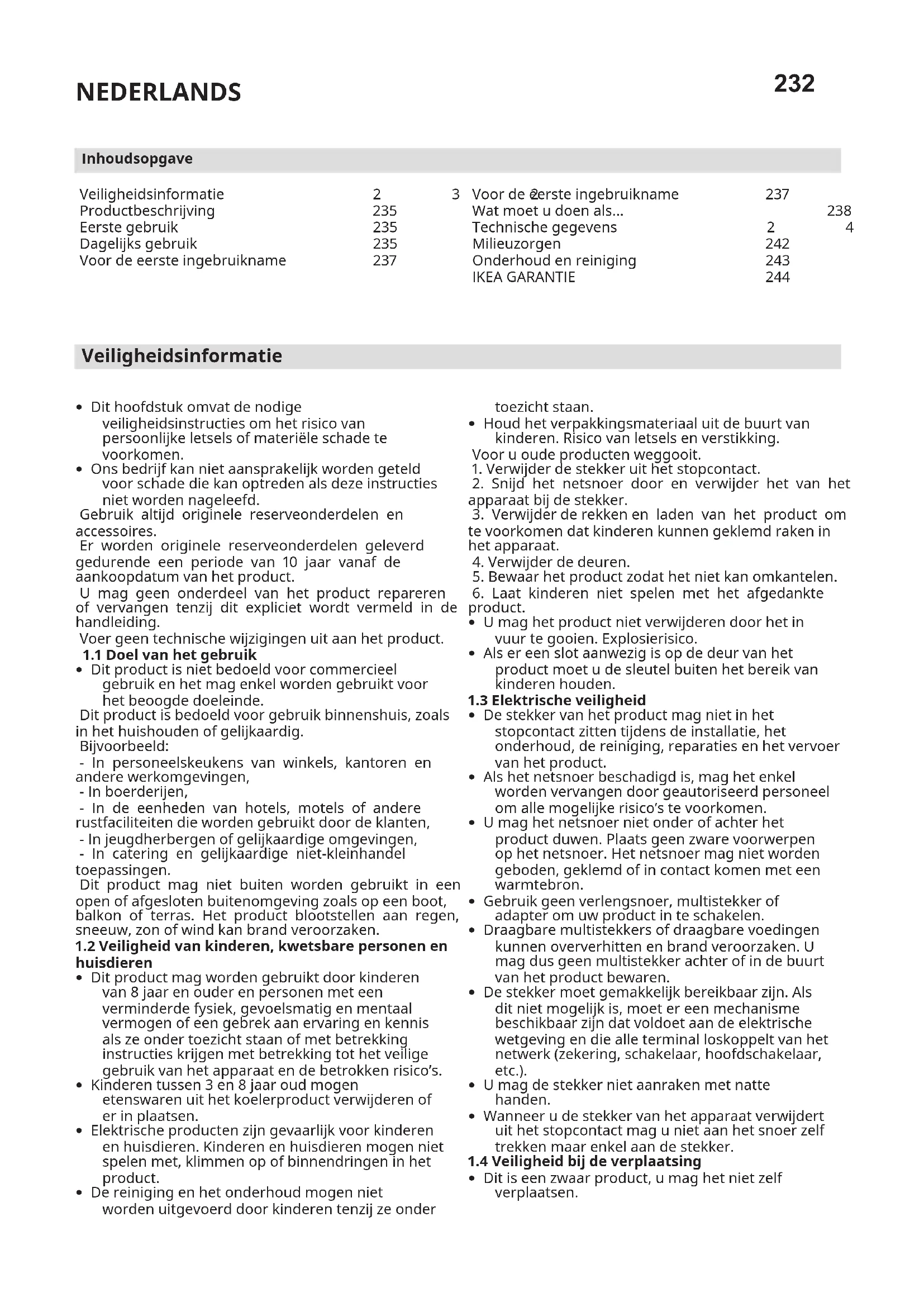 - Dit is een zwaar product, u mag het niet zelf verplaatsen. NEDERLANDS Veiligheidsinformatie 232 Productbeschrijving 235 Eerste gebruik 235 Dagelijks gebruik 235 Voor de eerste ingebruikname 237 Inhoudsopgave Voor de eerste ingebruikname 237 Wat moet u doen als... 238 Technische gegevens 242 Milieuzorgen 242 Onderhoud en reiniging 243 IKEA GARANTIE 244 232NEDERLANDS