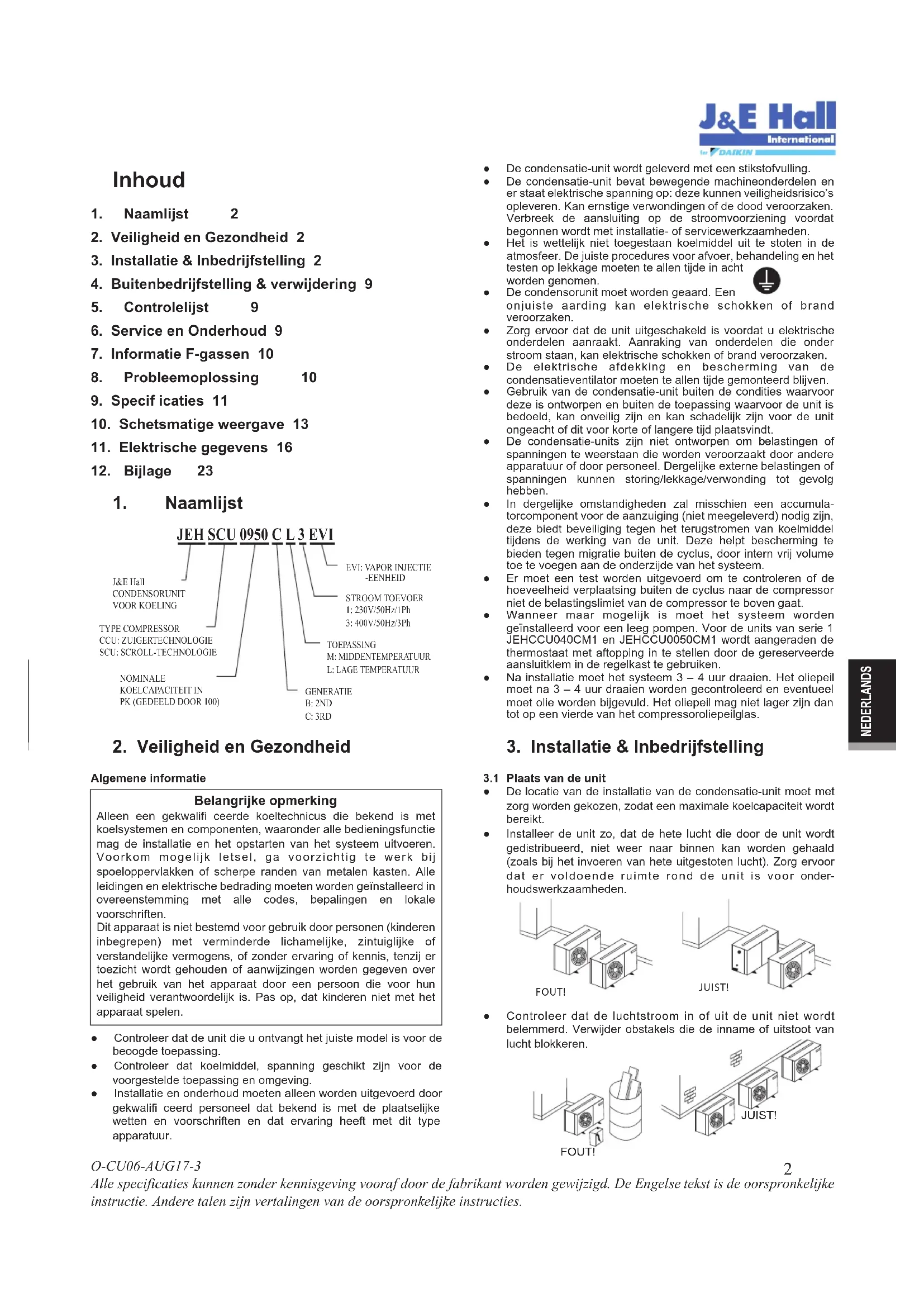 EVI: VAPOR INJECTIE -EENHEIDSTROOM TOEVOER1: 230V/50Hz/1Ph3: 400V/50Hz/3PhTOEPASSINGM: MIDDENTEMPERATUURL: LAGE TEMPERATUURGENERATIEB: 2NDC: 3RDNOMINALEKOELCAPACITEIT INPK (GEDEELD DOOR 100)TYPE COMPRESSORCCU: ZUIGERTECHNOLOGIESCU: SCROLL-TECHNOLOGIEJ&E HallCONDENSORUNITVOOR KOELING ● De condensatie-unit wordt geleverd met een stikstofvulling. ● De condensatie-unit bevat bewegende machineonderdelen en er staat elektrische spanning op: deze kunnen veiligheidsrisico’s opleveren. Kan ernstige verwondingen of de dood veroorzaken. Verbreek de aansluiting op de stroomvoorziening voordat begonnen wordt met installatie- of servicewerkzaamheden. ● Het is wettelijk niet toegestaan koelmiddel uit te stoten in de atmosfeer. De juiste procedures voor afvoer, behandeling en het testen op lekkage moeten te allen tijde in acht worden genomen. ● De condensorunit moet worden geaard. Een onjuiste aarding kan elektrische schokken of brand veroorzaken. ● Zorg ervoor dat de unit uitgeschakeld is voordat u elektrische onderdelen aanraakt. Aanraking van onderdelen die onder stroom staan, kan elektrische schokken of brand veroorzaken. ● De elektrische afdekking en bescherming van de condensatieventilator moeten te allen tijde gemonteerd blijven. ● Gebruik van de condensatie-unit buiten de condities waarvoor deze is ontworpen en buiten de toepassing waarvoor de unit is bedoeld, kan onveilig zijn en kan schadelijk zijn voor de unit ongeacht of dit voor korte of langere tijd plaatsvindt. ● De condensatie-units zijn niet ontworpen om belastingen of spanningen te weerstaan die worden veroorzaakt door andere apparatuur of door personeel. Dergelijke externe belastingen of spanningen kunnen storing/lekkage/verwonding tot gevolg hebben. ● In dergelijke omstandigheden zal misschien een accumula- torcomponent voor de aanzuiging (niet meegeleverd) nodig zijn, deze biedt beveiliging tegen het terugstromen van koelmiddel tijdens de werking van de unit. Deze helpt bescherming te bieden tegen migratie buiten de cyclus, door intern vrij volume toe te voegen aan de onderzijde van het systeem. ● Er moet een test worden uitgevoerd om te controleren of de hoeveelheid verplaatsing buiten de cyclus naar de compressor niet de belastingslimiet van de compressor te boven gaat. ● Wanneer maar mogelijk is moet het systeem worden geïnstalleerd voor een leeg pompen. Voor de units van serie 1 JEHCCU040CM1 en JEHCCU0050CM1 wordt aangeraden de thermostaat met aftopping in te stellen door de gereserveerde aansluitklem in de regelkast te gebruiken. ● Na installatie moet het systeem 3 – 4 uur draaien. Het oliepeil moet na 3 – 4 uur draaien worden gecontroleerd en eventueel moet olie worden bijgevuld. Het oliepeil mag niet lager zijn dan tot op een vierde van het compressoroliepeilglas. JUIST!FOUT! FOUT! JUIST! ● Controleer dat de unit die u ontvangt het juiste model is voor de beoogde toepassing. ● Controleer dat koelmiddel, spanning geschikt zijn voor de voorgestelde toepassing en omgeving. ● Installatie en onderhoud moeten alleen worden uitgevoerd door gekwalifi ceerd personeel dat bekend is met de plaatselijke wetten en voorschriften en dat ervaring heeft met dit type apparatuur.
