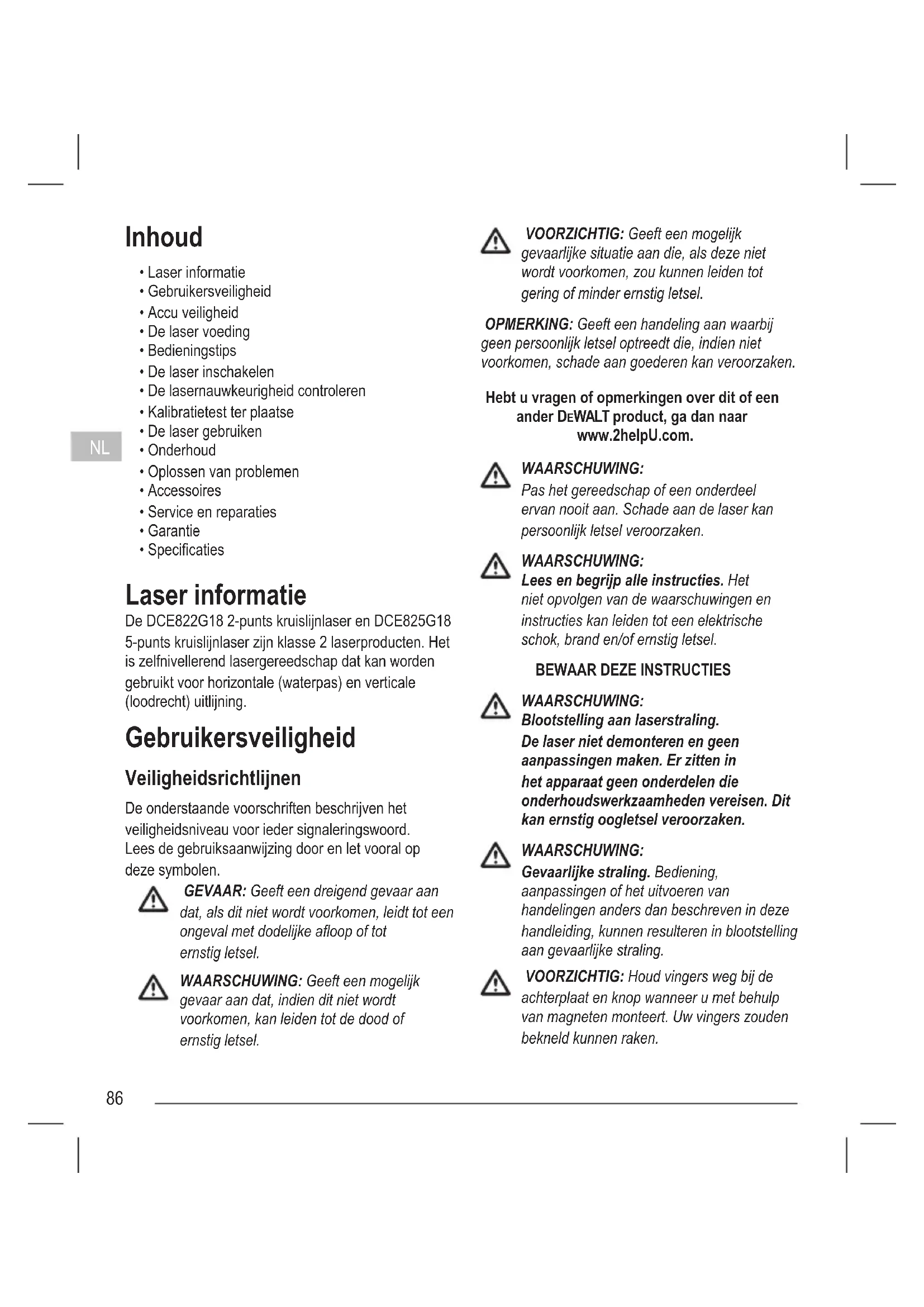 - Specicaties Laser informatie De DCE822G18 2-punts kruislijnlaser en DCE825G18 5-punts kruislijnlaser zijn klasse 2 laserproducten. Het is zelfnivellerend lasergereedschap dat kan worden gebruikt voor horizontale (waterpas) en verticale (loodrecht) uitlijning. Gebruikersveiligheid Veiligheidsrichtlijnen De onderstaande voorschriften beschrijven het veiligheidsniveau voor ieder signaleringswoord. Lees de gebruiksaanwijzing door en let vooral op deze symbolen. GEVAAR: Geeft een dreigend gevaar aan dat, als dit niet wordt voorkomen, leidt tot een ongeval met dodelijke aoop of tot ernstig letsel. WAARSCHUWING: Geeft een mogelijk gevaar aan dat, indien dit niet wordt voorkomen, kan leiden tot de dood of ernstig letsel. VOORZICHTIG: Geeft een mogelijk gevaarlijke situatie aan die, als deze niet wordt voorkomen, zou kunnen leiden tot gering of minder ernstig letsel. OPMERKING: Geeft een handeling aan waarbij geen persoonlijk letsel optreedt die, indien niet voorkomen, schade aan goederen kan veroorzaken. Hebt u vragen of opmerkingen over dit of een ander DEWALT product, ga dan naar www.2helpU.com. WAARSCHUWING: Pas het gereedschap of een onderdeel ervan nooit aan. Schade aan de laser kan persoonlijk letsel veroorzaken. WAARSCHUWING: Lees en begrijp alle instructies. Het niet opvolgen van de waarschuwingen en instructies kan leiden tot een elektrische schok, brand en/of ernstig letsel.