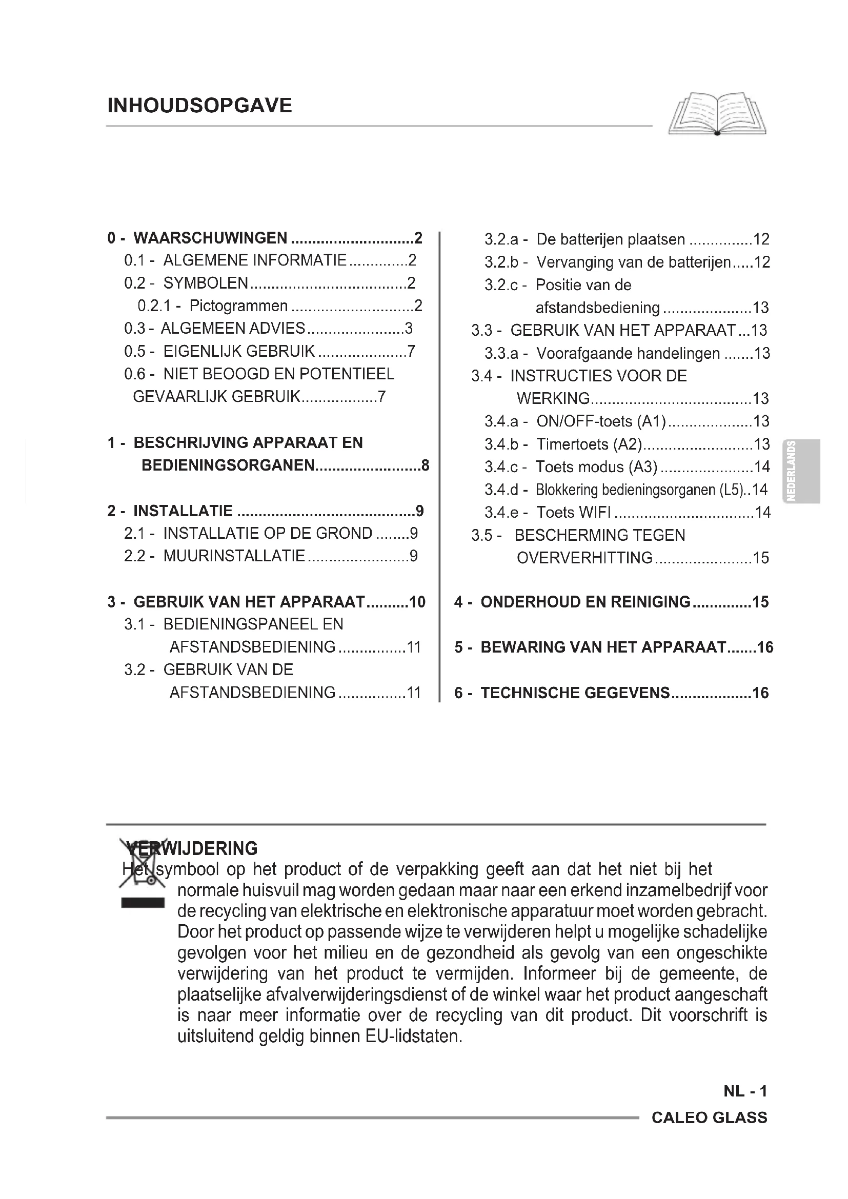 Dit product mag uitsluitend worden gebruikt volgens de spe- cicaties, aangeduid in deze handleiding. Als het op een andere wijze wordt gebruikt dan aangeduid kan dit leiden tot zware on- gevallen. DE FABRIKANT KAN NIET AANSPRAKELIJK WORDEN GESTELD VOOR SCHADE AAN PERSONEN OF ZAKEN, VOORTVLOEIEND UIT HET NIET IN ACHT NEMEN VAN DE NORMEN, AANWEZIG IN DEZE HANDLEIDING.CALEO GLASS NEDERLANDS NL - 9