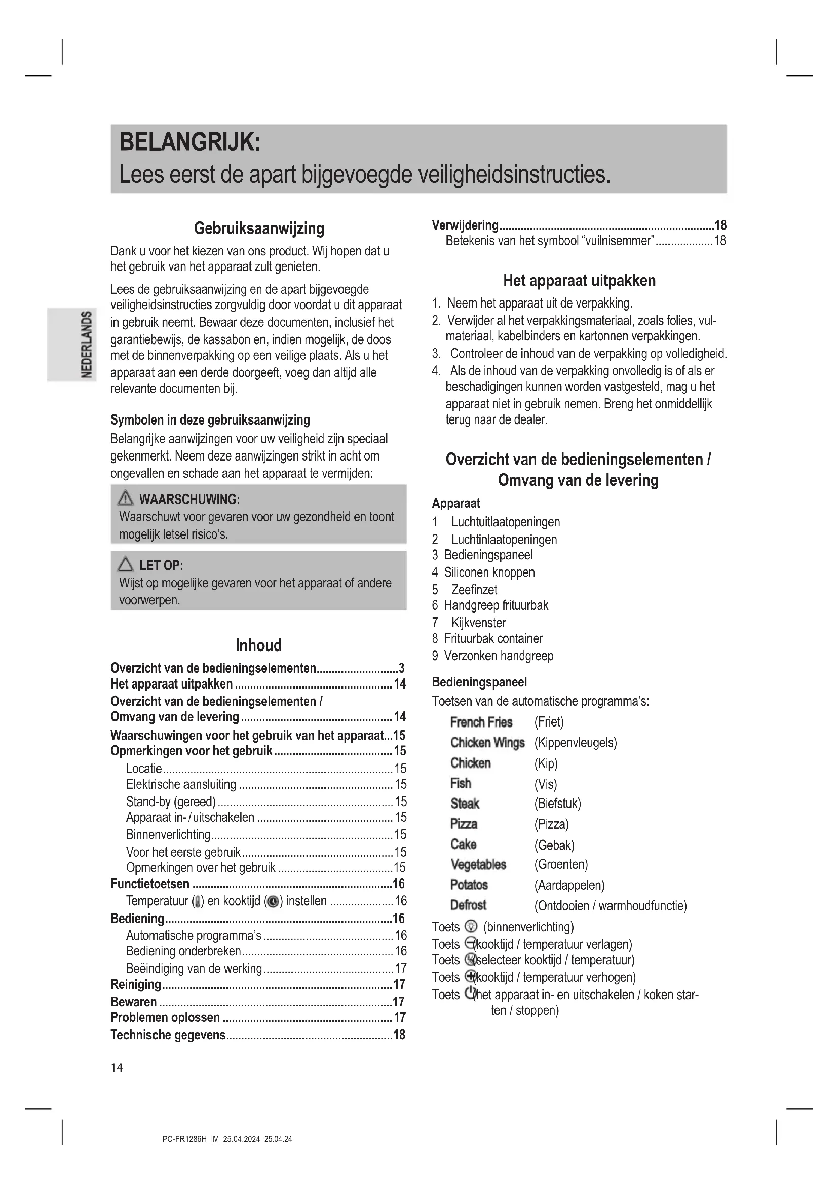 Probleem Mogelijke oorzaak Remedie Het voedsel is niet volle- dig gaar. De frituurcontainer is te vol. Verminder de hoeveelheid voedsel. Klei- nere hoeveelheden worden gelijkmatiger gaar. De temperatuur is te laag ingesteld. Stel een hogere temperatuur in. De kooktijd is te kort ingesteld. Stel een langere bereidingstijd in. Het voedsel is ongelijk- matig gaar. Het voedsel ligt op elkaar. Dit zorgt niet voor voldoende luchtcirculatie. Schud het voedsel halverwege de berei- dingstijd. Het voedsel is niet knapperig. Je hebt voedsel gebruikt dat alleen geschikt is voor een conventionele friteuse. Gebruik voedsel dat geschikt is voor de oven of bestrijk het met een beetje olie. Er komt rook uit het apparaat. U bereidt zeer vet voedsel. Er kan rook ontstaan door vetspatten in het apparaat. Zorg voor voldoende ventilatie. De frituurcontainer is te vol. Het voedsel raakt het verwarmingselement. Verminder de hoeveelheid voedsel. Er zitten nog etensresten / vetresten in de frituurcontainer of op het verwarmingselement van eerder gebruik. Reinig het apparaat na elk gebruik zoals beschreven in het hoofdstuk “Reiniging”. Technische gegevens Model:..............................................................PC-FR 1286 H Stroomvoorziening: ............................220 – 240 V~, 50 – 60 Hz Stroomverbruik: ........................................................... 1700 W Beschermingsklasse: ............................................................. Nettogewicht: ........................................................ ong. 4,9 kg Dit product bevat een lichtbron van energie-efficiëntieklasse < G >. De lichtbron is bestand tegen hoge temperaturen en is alleen bedoeld voor gebruik in dit apparaat. Het recht om technische en ontwerpaanpassingen te ma- ken in de loop van voortdurende productontwikkeling blijft voorbehouden. Dit apparaat is getest volgens alle van toepassing zijnde, huidige CE-richtlijnen en gebouwd volgens de meest recente veiligheidsvoorschriften. Verwijdering Betekenis van het symbool “vuilnisemmer” Bescherm ons milieu, elektrische apparaten ho- ren niet in het huisafval. Maak voor het afvoeren van elektrische appara- ten gebruik van de voorgeschreven verzamel- punten en geef daar de elektrische apparaten af die u niet meer gebruikt. Daardoor helpt u de potentiële effecten te voorkomen die een verkeerde afvoer op het milieu en de menselijke gezondheid kunnen hebben. Op deze wijze levert u uw bijdrage aan het hergebruik, de recycling en andere verwerkingsvormen voor oude elektro- nische en elektrische apparaten. Voor informatie over verzamelpunten voor uw apparaten kunt u contact opnemen met uw gemeente of gemeen- teadministratie. Uw dealer en contractpartner is bovendien verplicht het oude apparaat gratis terug te nemen.PC-FR1286H_IM_25.04.2024 25.04.24