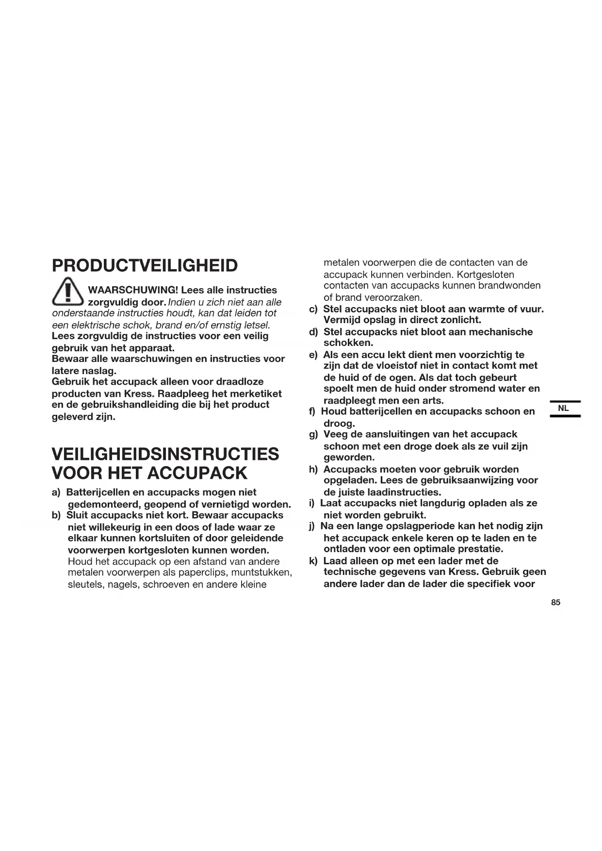 PRODUCTVEILIGHEID WAARSCHUWING! Lees alle instructies zorgvuldig door. Indien u zich niet aan alle onderstaande instructies houdt, kan dat leiden tot een elektrische schok, brand en/of ernstig letsel. Lees zorgvuldig de instructies voor een veilig gebruik van het apparaat. Bewaar alle waarschuwingen en instructies voor latere naslag. Gebruik het accupack alleen voor draadloze producten van Kress. Raadpleeg het merketiket en de gebruikshandleiding die bij het product geleverd zijn. VEILIGHEIDSINSTRUCTIES