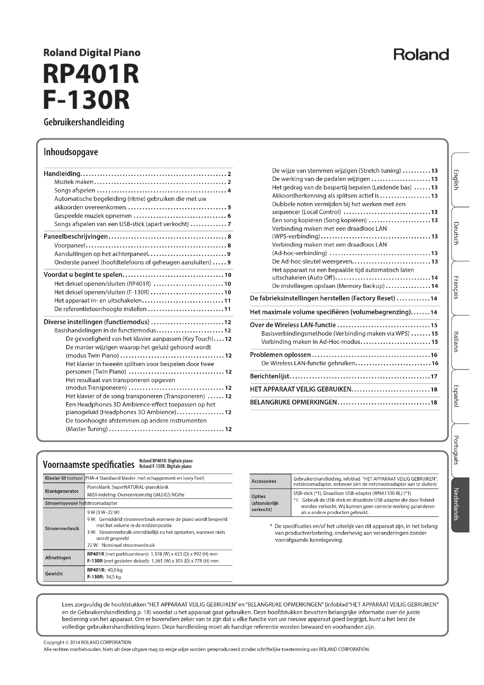 BELANGRIJKE OPMERKINGEN . . . . . . . . . . . . . . . . . . . . . . . . . . . . . . . . . 18 Inhoudsopgave Lees zorgvuldig de hoofdstukken “HET APPARAAT VEILIG GEBRUIKEN” en “BELANGRIJKE OPMERKINGEN” (infoblad “HET APPARAAT VEILIG GEBRUIKEN” en de Gebruikershandleiding p. 18) voordat u het apparaat gaat gebruiken. Deze hoofdstukken bevatten belangrijke informatie over de juiste bediening van het apparaat. Om er bovendien zeker van te zijn dat u elke functie van uw nieuwe apparaat goed begrijpt, kunt u het best de volledige gebruikershandleiding lezen. Deze handleiding moet als handige referentie worden bewaard en voorhanden zijn. Copyright © 2014 ROLAND CORPORATION Alle rechten voorbehouden. Niets uit deze uitgave mag op enige wijze worden gereproduceerd zonder schriftelijke toestemming van ROLAND CORPORATION. Voornaamste specicaties Roland RP401R: Digitale pianoRoland F-130R: Digitale pianoKlavier 88 toetsen (PHA-4 Standaard klavier: met echappement en Ivory Feel)KlankgeneratorPianoklank: SuperNATURAL-pianoklankMIDI-indeling: Overeenkomstig GM2/GS/XGliteStroomtoevoer NetstroomadapterStroomverbruik9 W (3 W–22 W)9 W: Gemiddeld stroomverbruik wanneer de piano wordt bespeeld met het volume in de middenpositie3 W: Stroomverbruik onmiddellijk na het opstarten, wanneer niets wordt gespeeld22 W: Nominaal stroomverbruikAfmetingenRP401R (met partituursteun): 1.378 (W) x 423 (D) x 992 (H) mmF-130R (met gesloten deksel): 1.361 (W) x 305 (D) x 778 (H) mmGewichtRP401R: 40,0 kgF-130R: 34,5 kgAccessoiresGebruikershandleiding, infoblad “HET APPARAAT VEILIG GEBRUIKEN”, netstroomadapter, netsnoer (om de netstroomadapter aan te sluiten)Opties(afzonderlijk verkocht)USB-stick (*1), Draadloze USB-adapter (WNA1100-RL) (*1)*1: Gebruik de USB-stick en draadloze USB-adapter die door Roland worden verkocht. Wij kunnen geen correcte werking garanderen als u andere producten gebruikt.